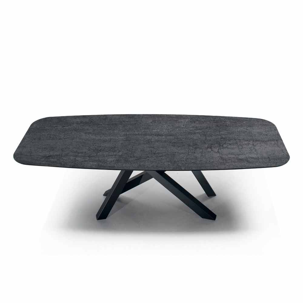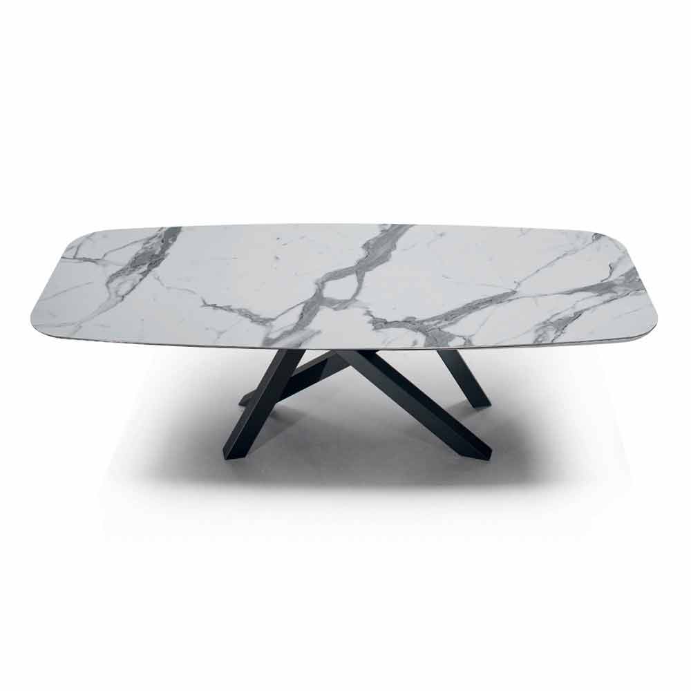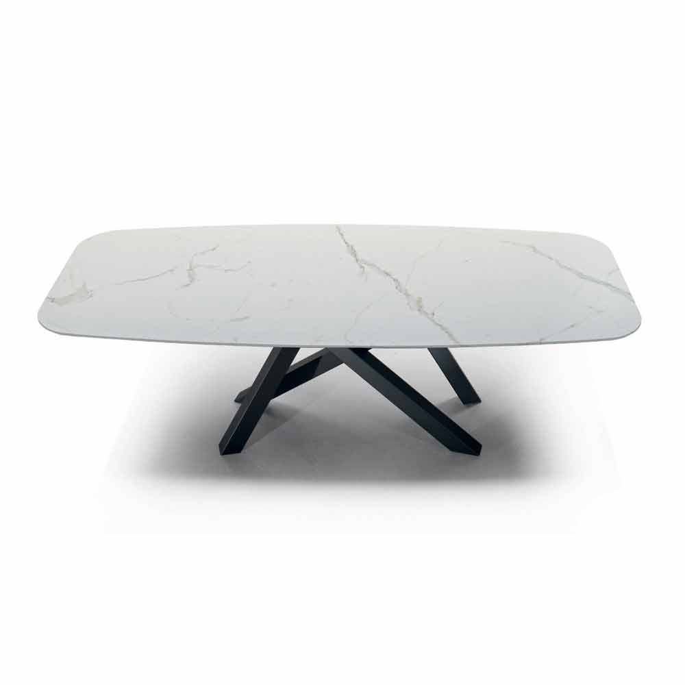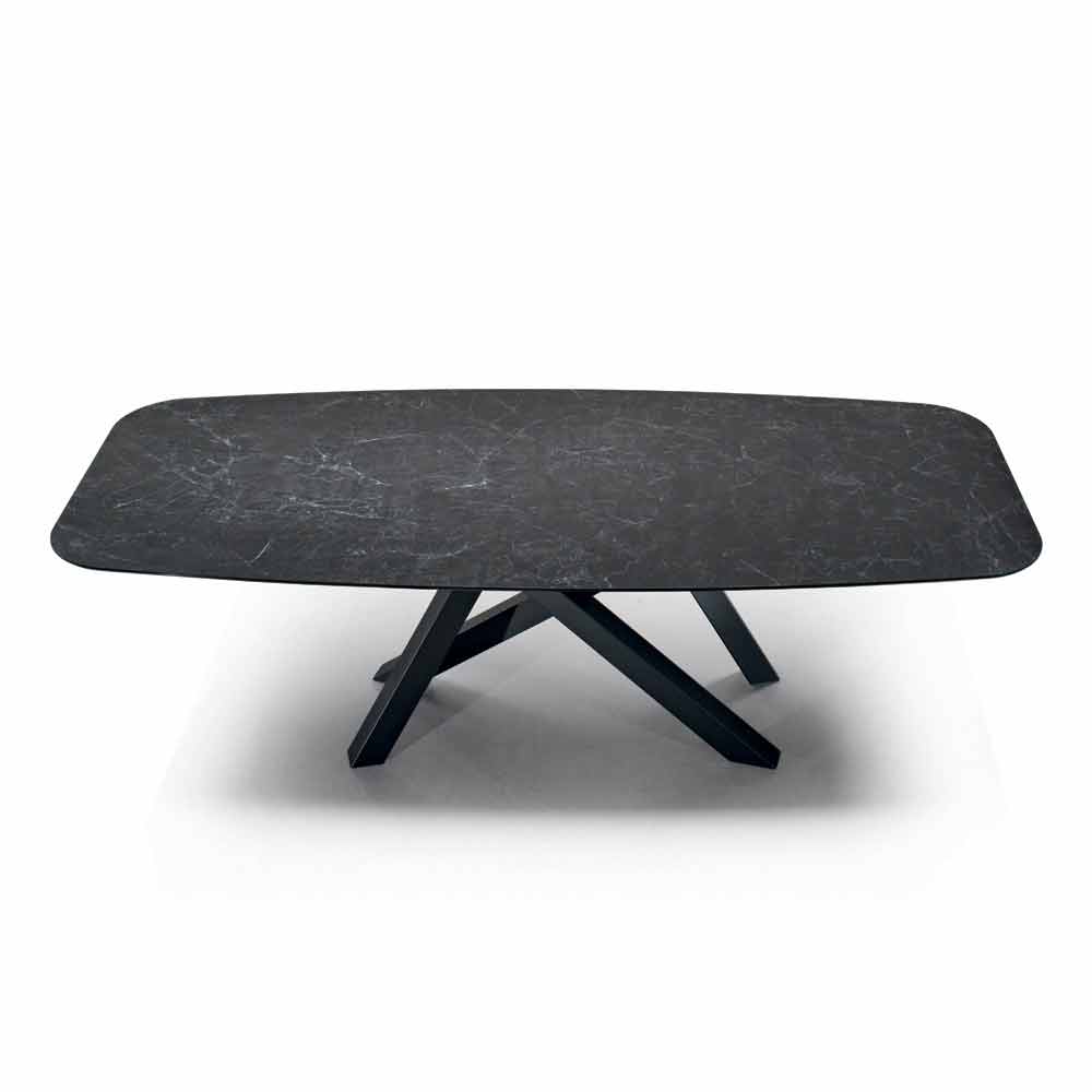Modern and elegant dining table handcrafted in Italy with barrel top in hypermarble laminam (thickness 10 + 6 mm) obtained from a plate of beveled glass and a ceramic plate and black painted steel base. Thanks to its captivating and refined aesthetics , this wonderful furnishing accessory transmits an exclusive touch to any environment thanks to the particular attention to detail and the use of high quality 100% Made in Italy raw materials . In fact, in addition to completing the look of the table with elegance, the laminam hyper-marble is a material that has numerous peculiarities which make it an ideal choice to provide at the same time a solid table top and a classy design capable of revolutionizing every environments with personality.