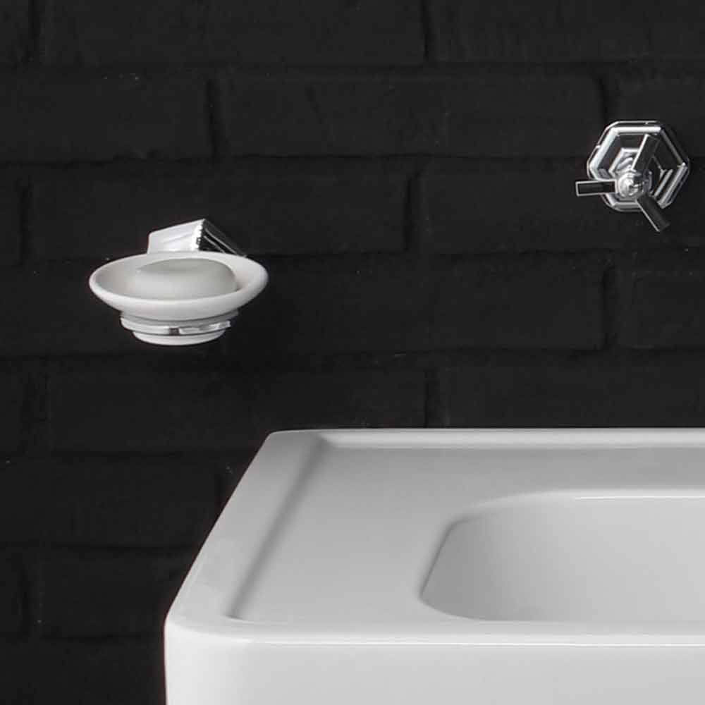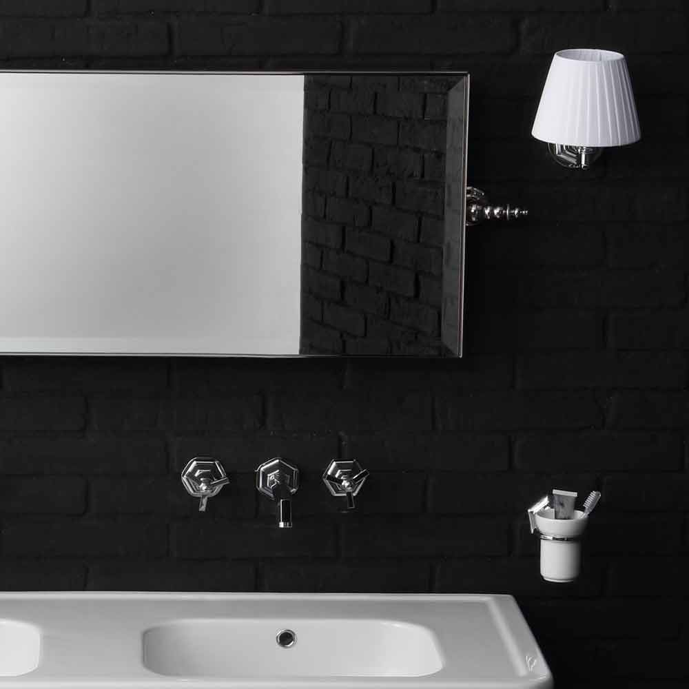 Double console on ceramic legs in the style of the 900 'Serenity Serenity is a beautiful and fascinating bathroom furniture composition made entirely of white ceramic from the 900 'style. This beautiful composition includes an elegant and spacious double washbasin, fixed to the wall and supported by a pair of legs, also in ceramic, all made up of an elegantly square shape. To give a touch of light to the entire composition, it includes taps, siphons and drains all in the chrome finish, in addition to the beautiful and spacious rectangular tilting mirror with chromed brass frame. Serenity is completed and enriched by the presence of a beautiful and elegant ceramic wall soap holder with chromed details and a toothbrush holder in the same design, all completed by two beautiful lux applique in chromed brass and cotton lampshade. Serenity is designed to bring a touch of 900 'style design to your home, always maintaining a certain modernity and elegance. Made up of elegantly square lines, Serenity fits harmoniously into any type of furniture. Bring a touch of style to your home too! Washbasin fixed to the wall using the supplied brackets!