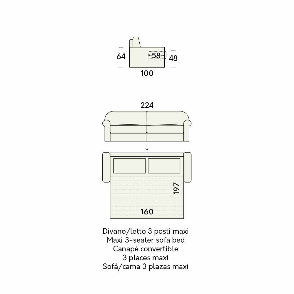 - L 224 x P 100 x H 93 cm (mattress: L 160 x P 197 x H 14 cm).