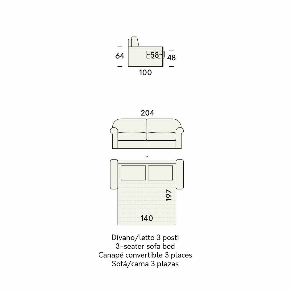 - L 204 x P 100 x H 93 cm (mattress: L 140 x P 197 x H 14 cm);