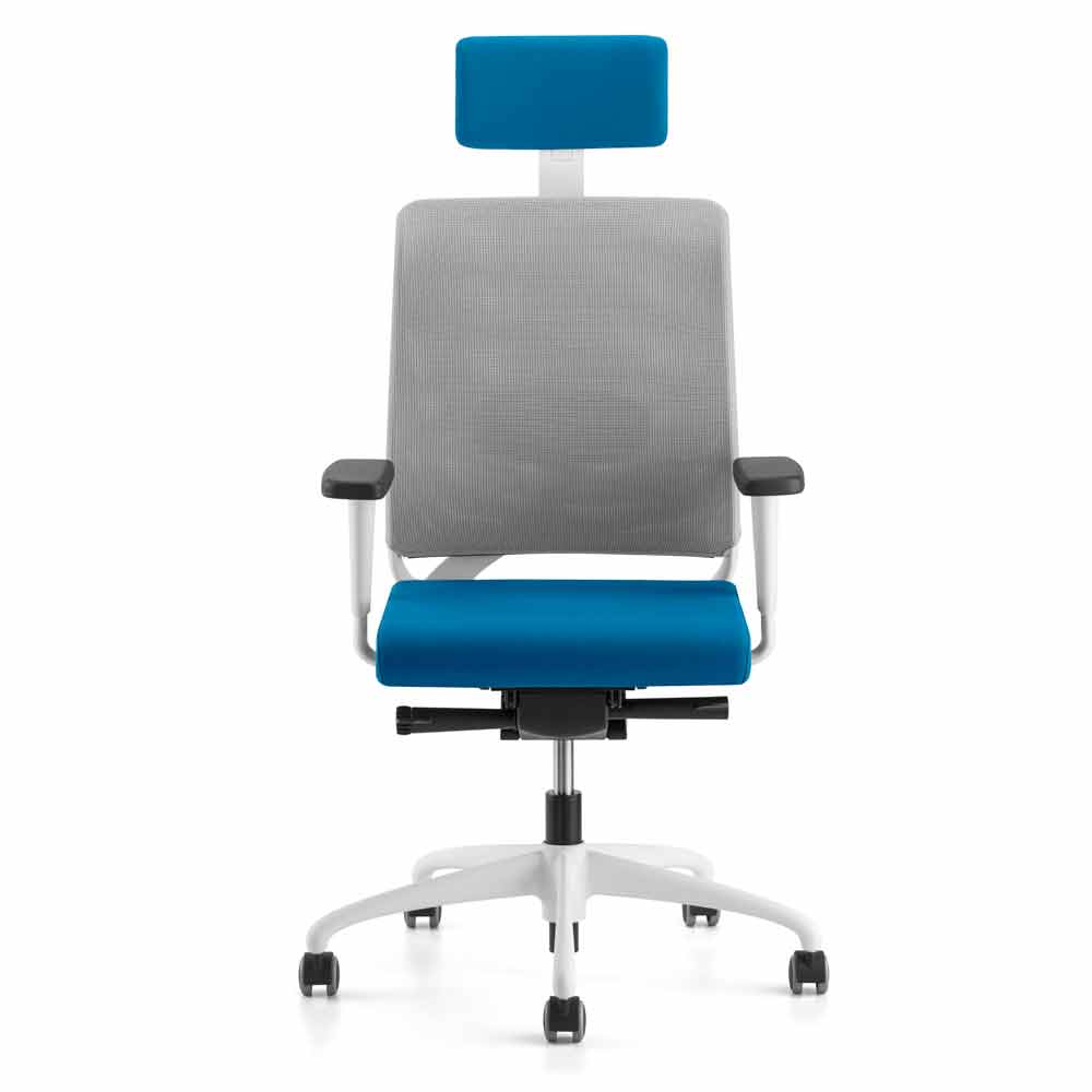 - structural elements such as backrest, base, armrests and headrest in white finish and blue fabric