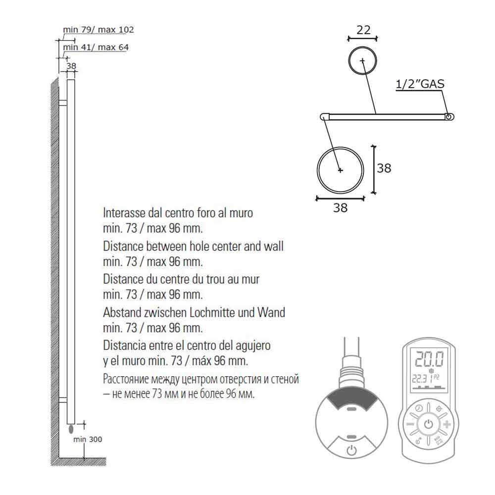 The dimension of the thermostat of 80 mm must be added to the height. Single-phase 230 volt power supply.