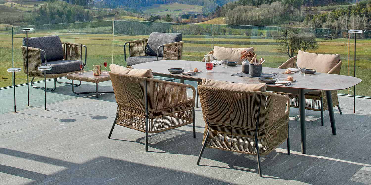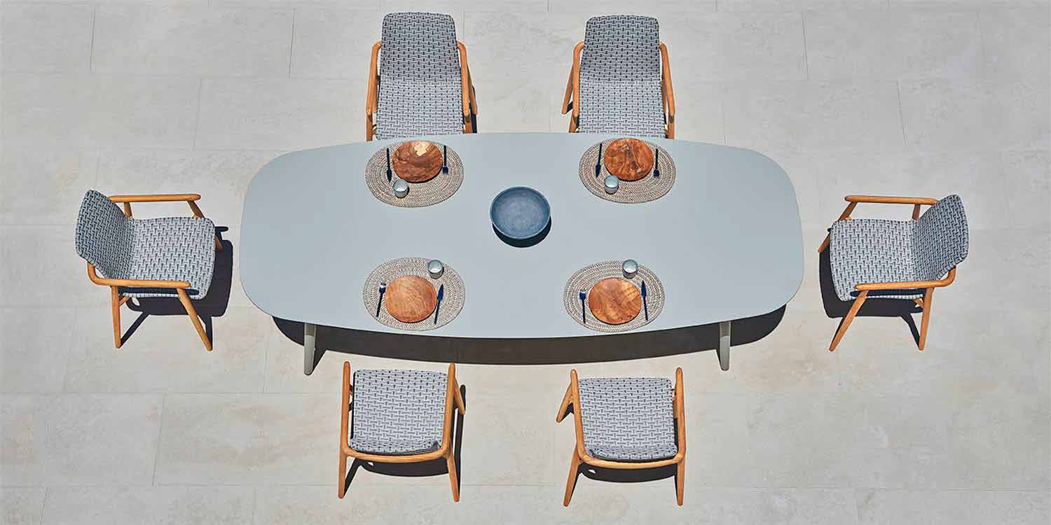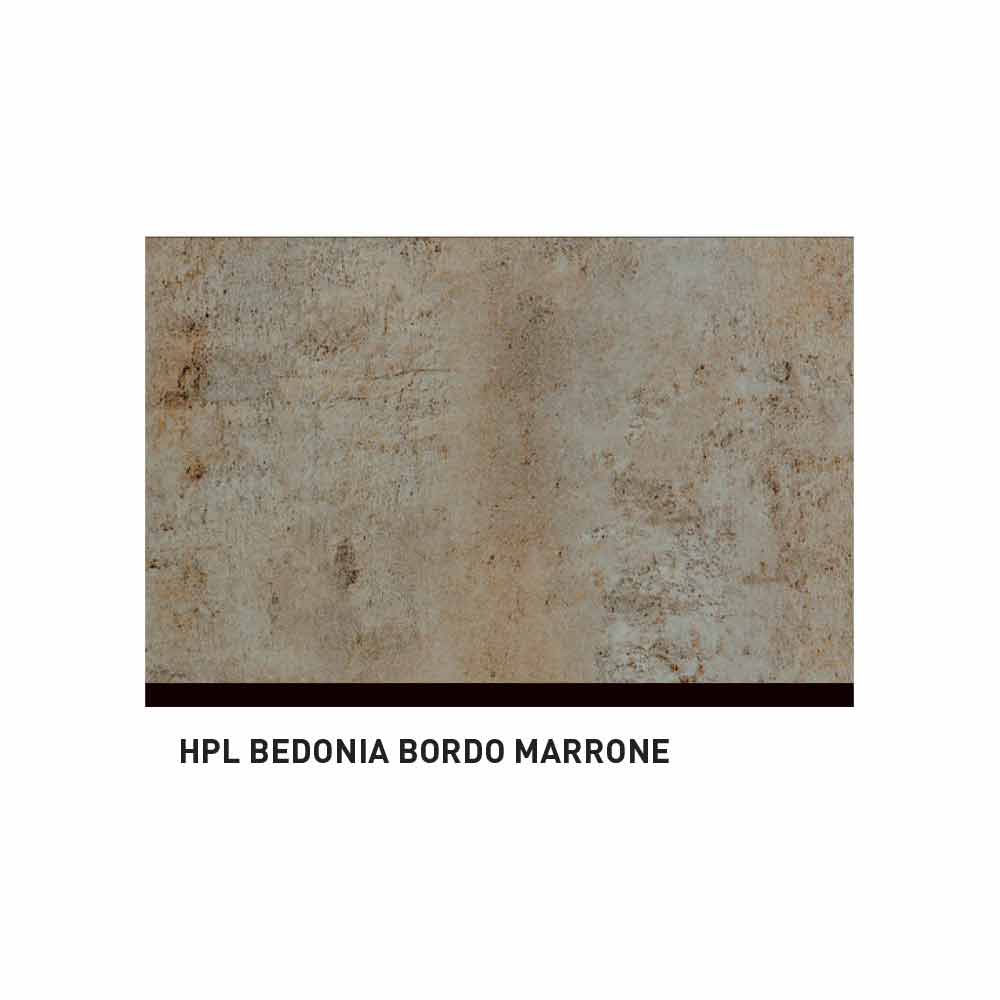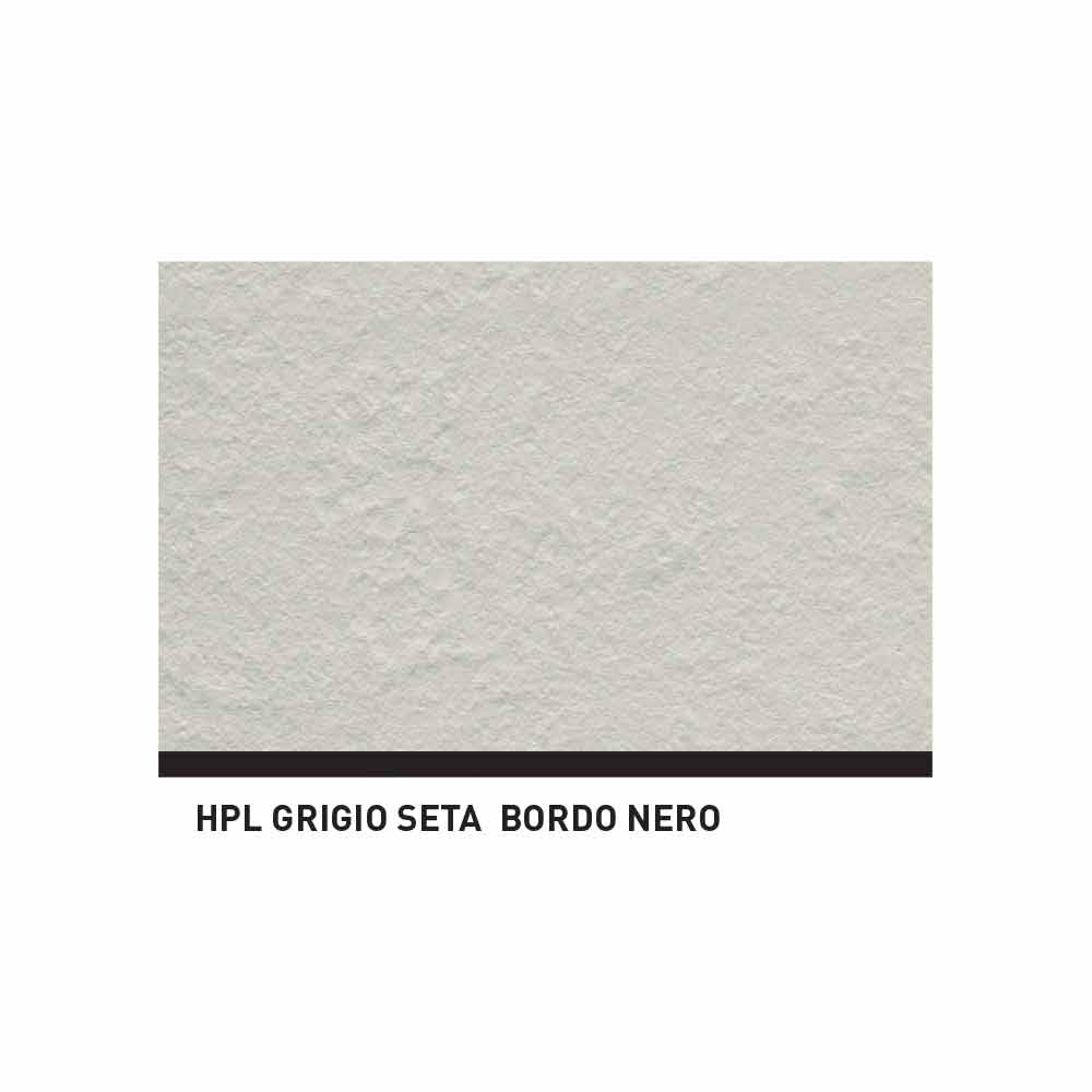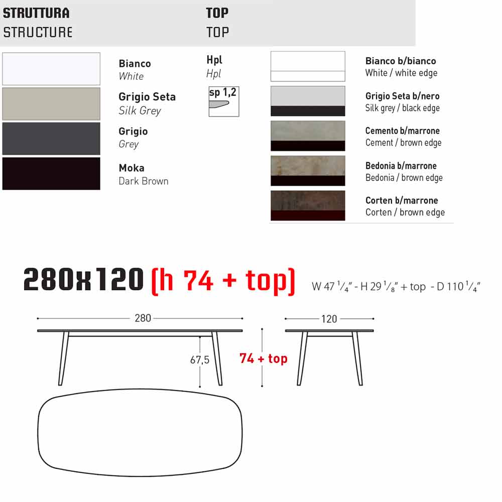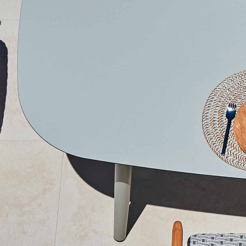 Ellisse is a fixed outdoor table with a powder-coated aluminum structure to choose from four colors: white, silk gray, gray and moka; with top in HPL (sp 1.2) in finishing: silk gray black border, white black border, anthracite black border, white white border, cement brown border, bedonia brown border, corten brown border; or with a bush-hammered ceramic top (sp 1.2) in the finish: white lime and gray porphyry.