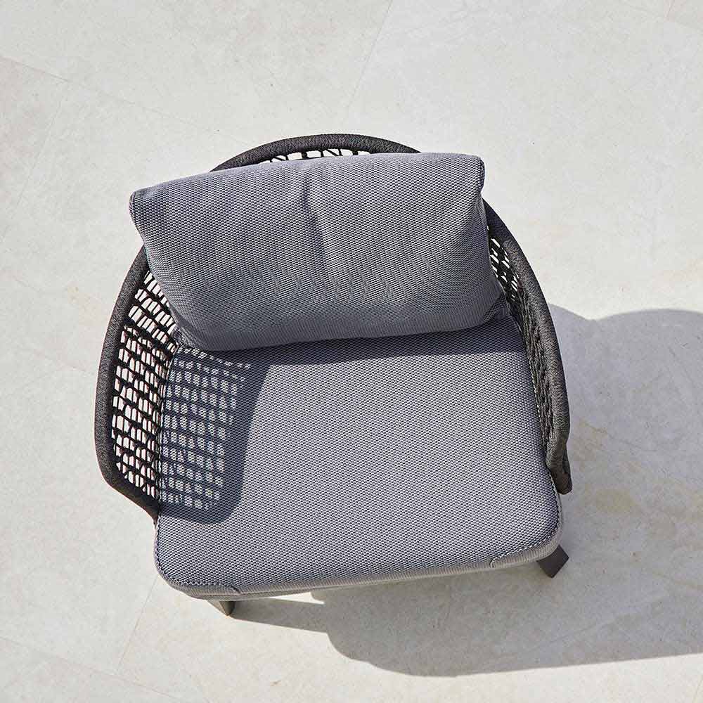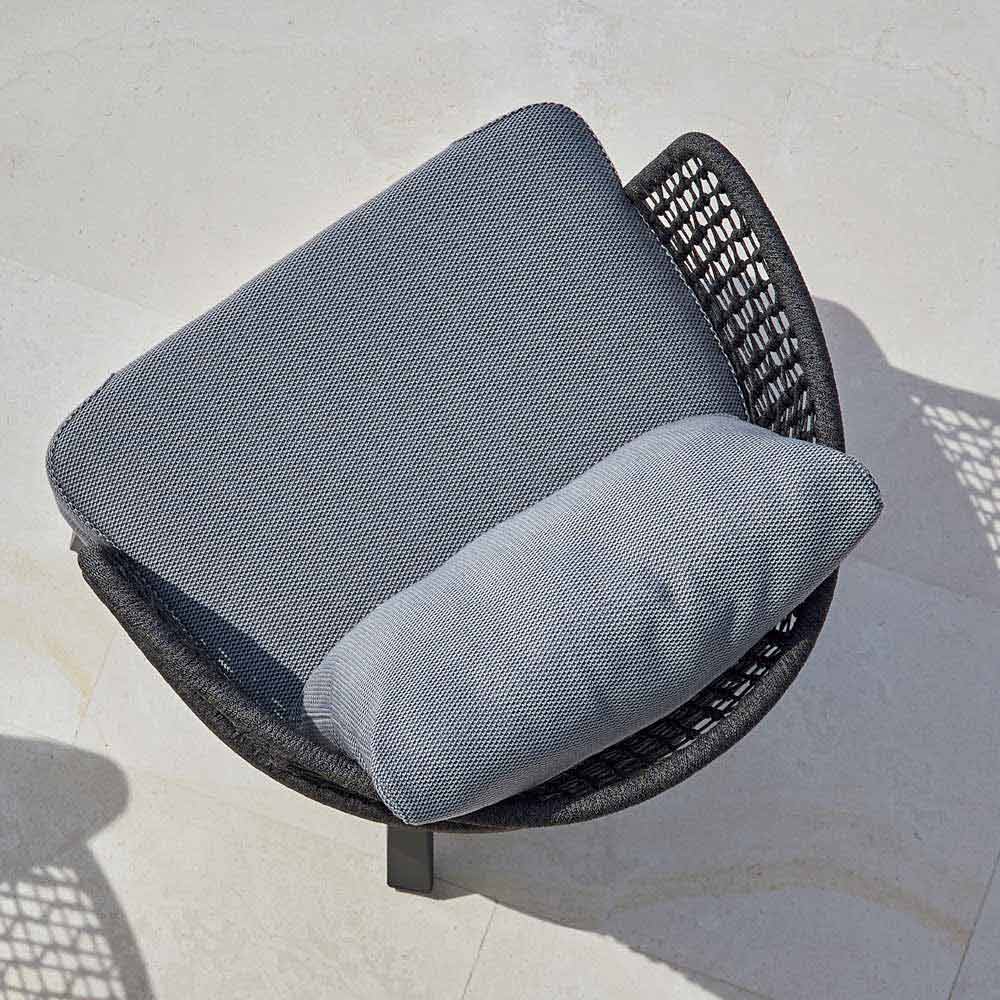Emma is a splendid outdoor armchair featuring a structure in hand-woven synthetic fiber with a dark gray powder-coated aluminum frame.