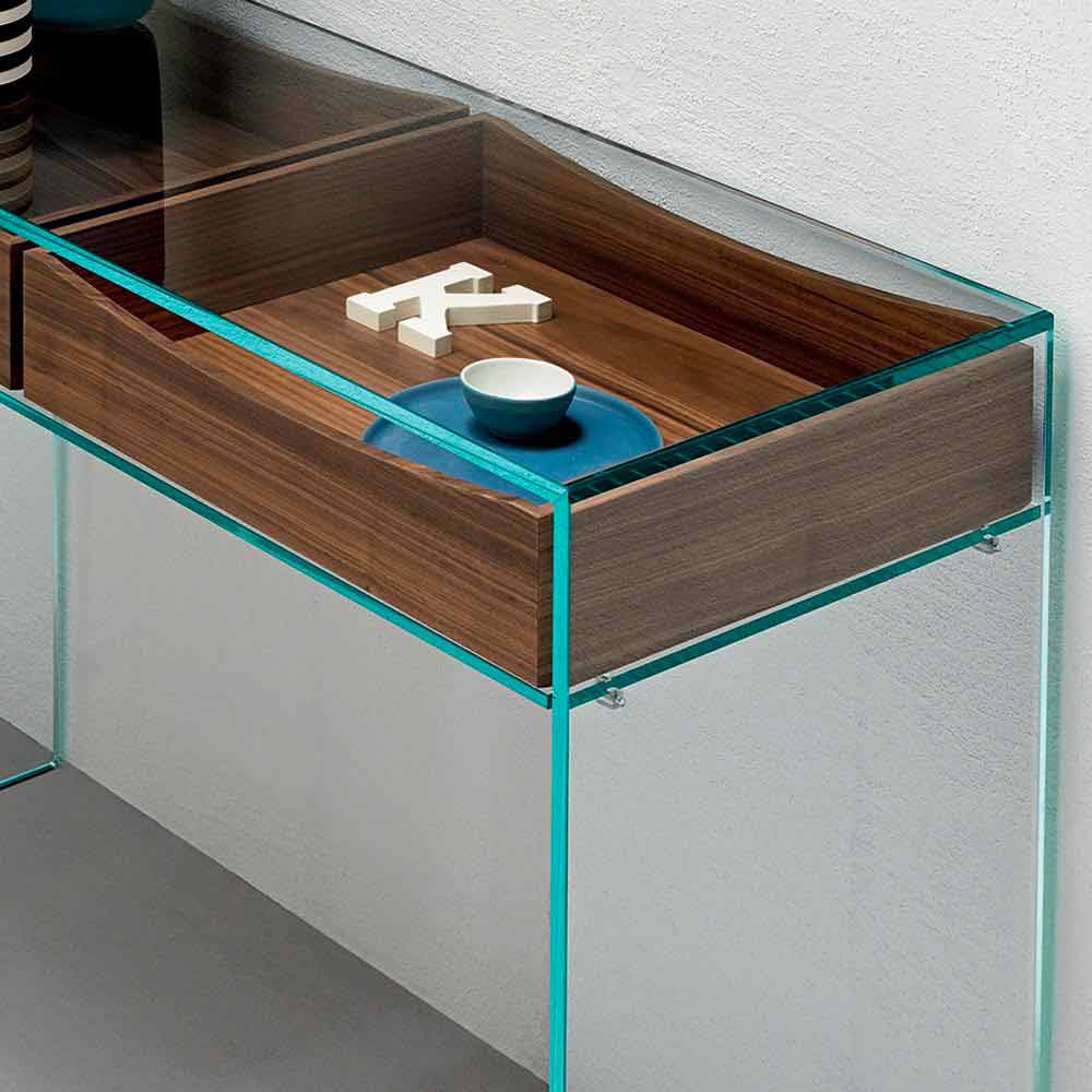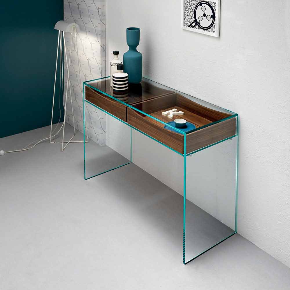 The console is a piece of furniture that can be used transversely in various contexts and has a simple and linear bridge structure made of extra-clear glass with two underlying drawers in canaletto walnut.