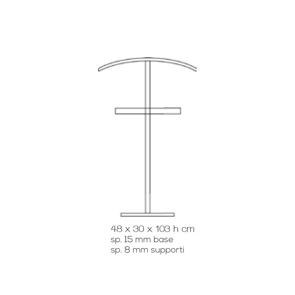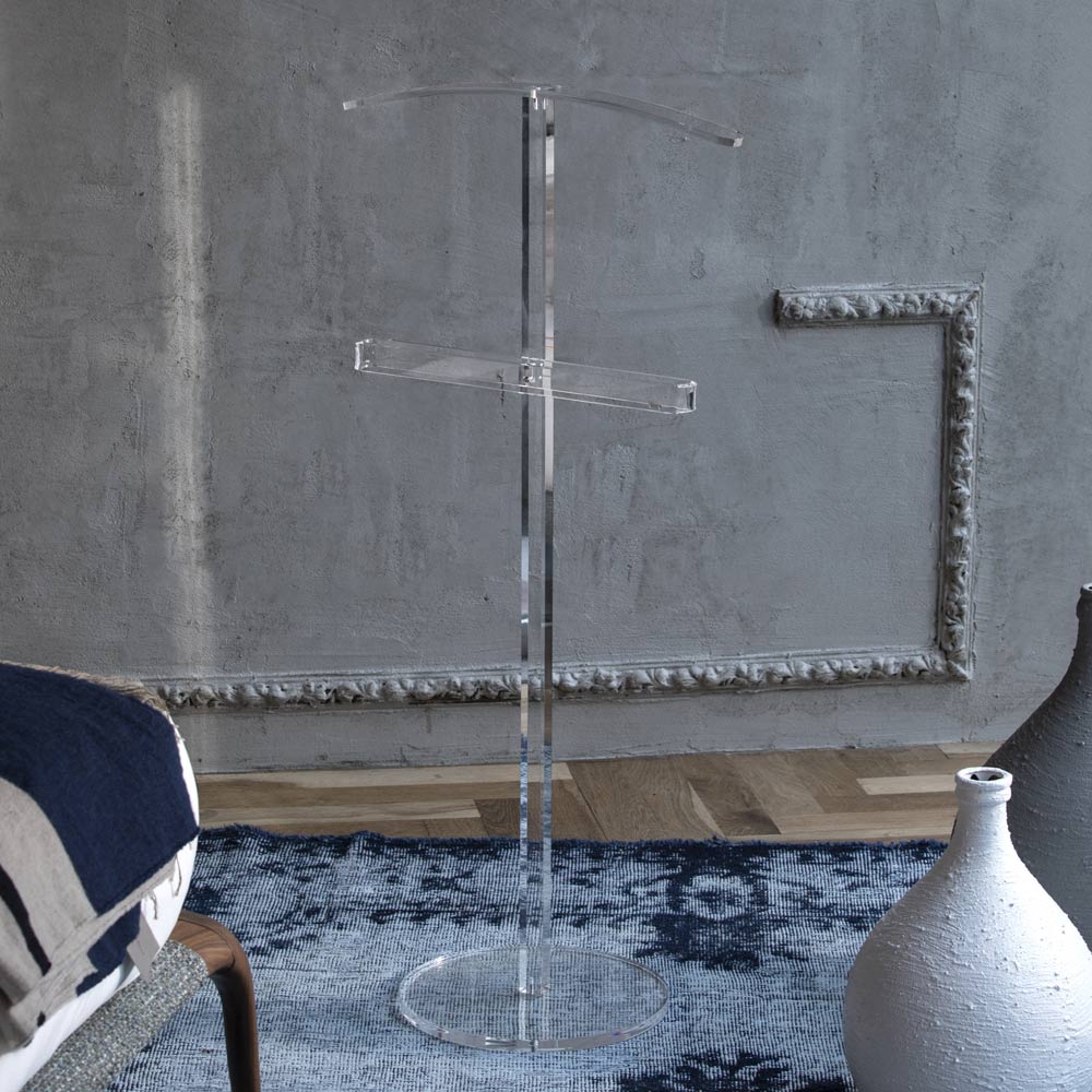 This bedroom valet has an essential and elegant design that becomes a real functional and decorative piece of furniture. Made entirely of clear acrylic crystal with an 8mm thick coat hanger and a 25mm thick square trouser rod, it features a round base of 30cm in diameter and 15mm in thickness.