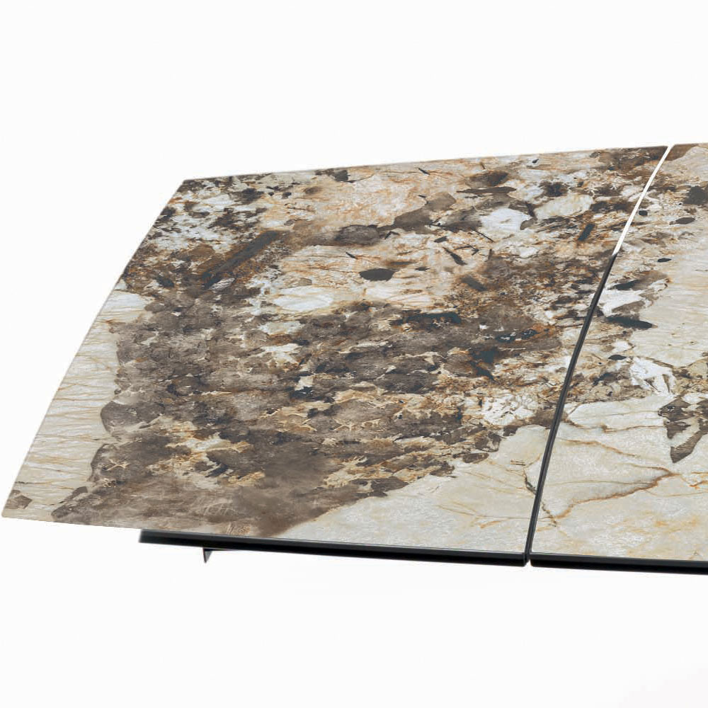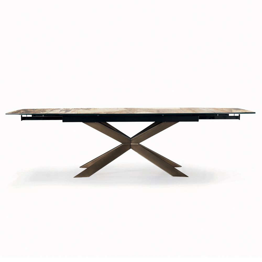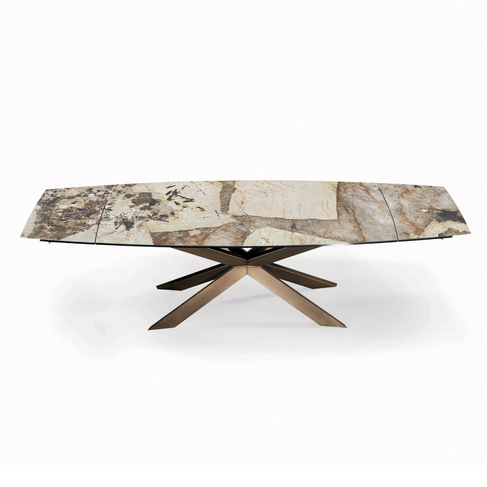 Extendable barrel-shaped living room table with integrated extensions, ceramic top with polished deset soul finish , straight edge, antique brass lacquered steel base with adjustable feet.