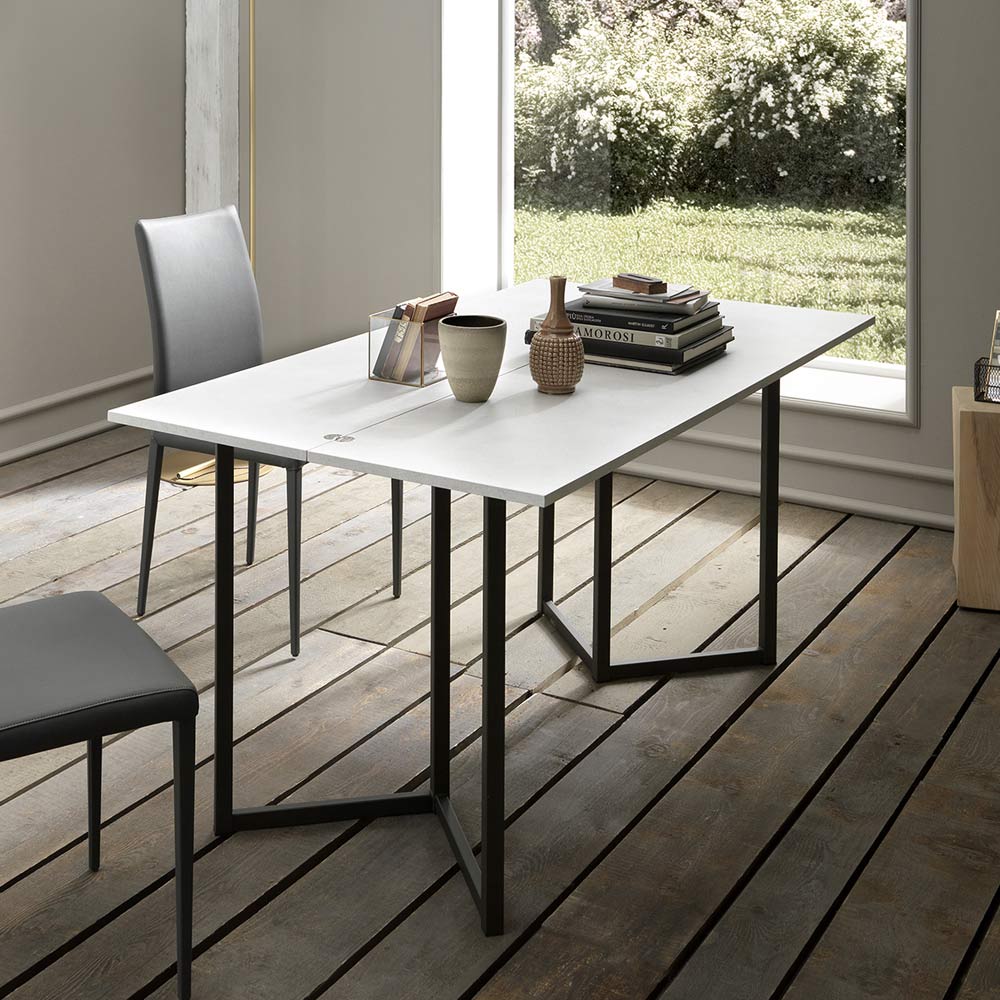 This extendable console made in Italy, has a structure in embossed graphite painted metal and an extendable melamine top with a folding mechanism which allows you to transform the console into a comfortable and practical dining table managing to reconcile functionality and design for a exclusive result and refined aesthetics .