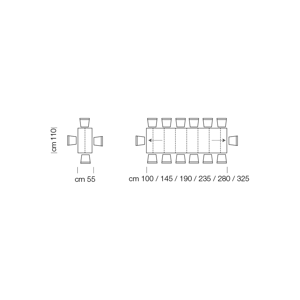 - L 55 (325) x P 110 x H 75 cm 14 seats extendable with six extensions of 45cm each outside.