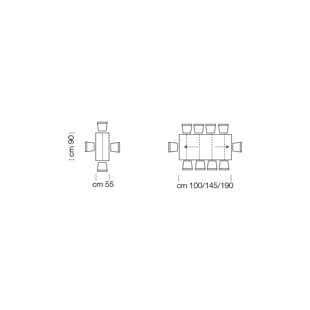 - L 55 (190) x P 90 x H 76 cm 10 places extensible with three extensions of 45cm each external;