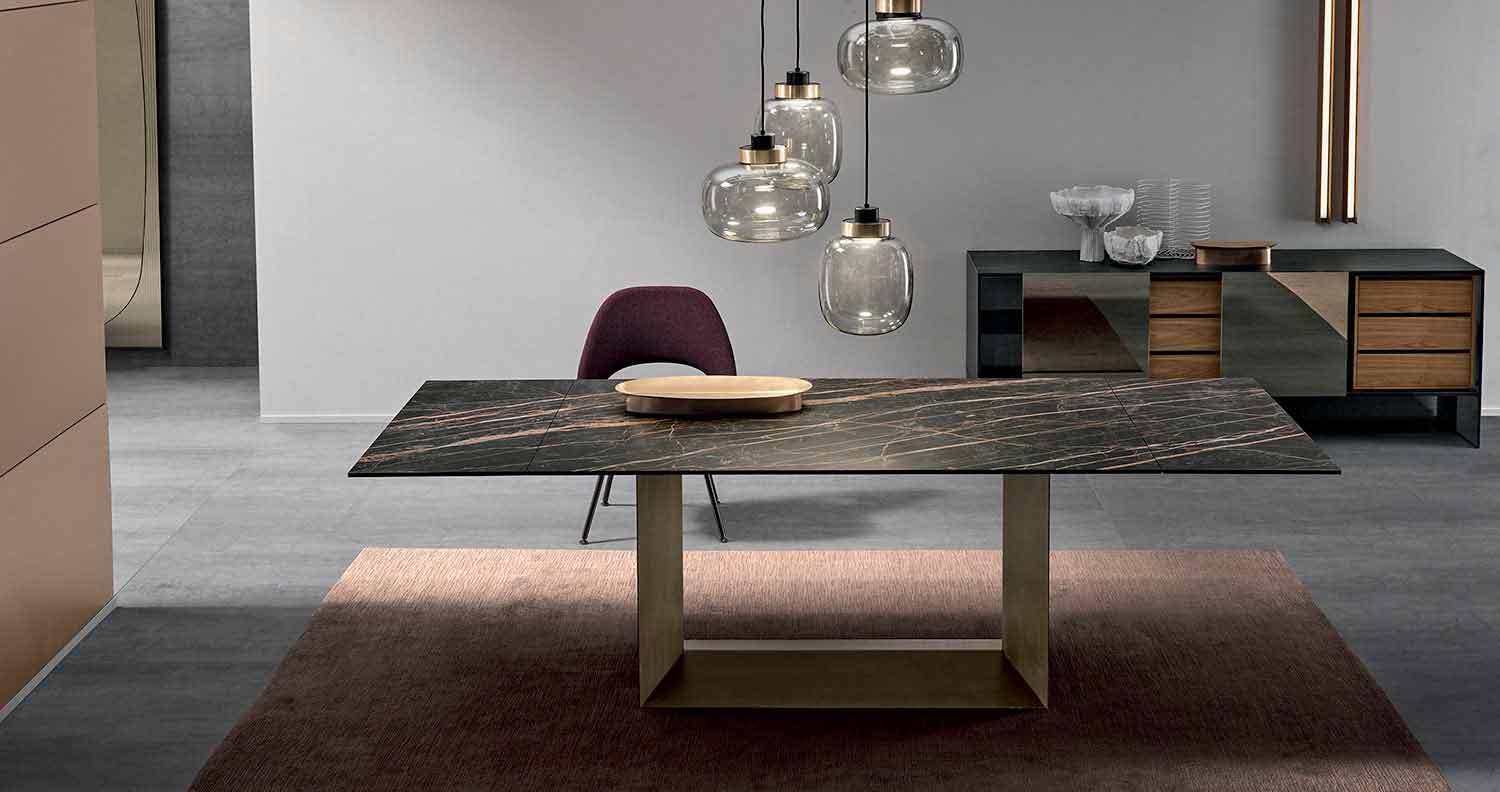 Luxury extendable table up to 12 seats with Noir Desir ceramic top and bronze metal base, made in Italy.