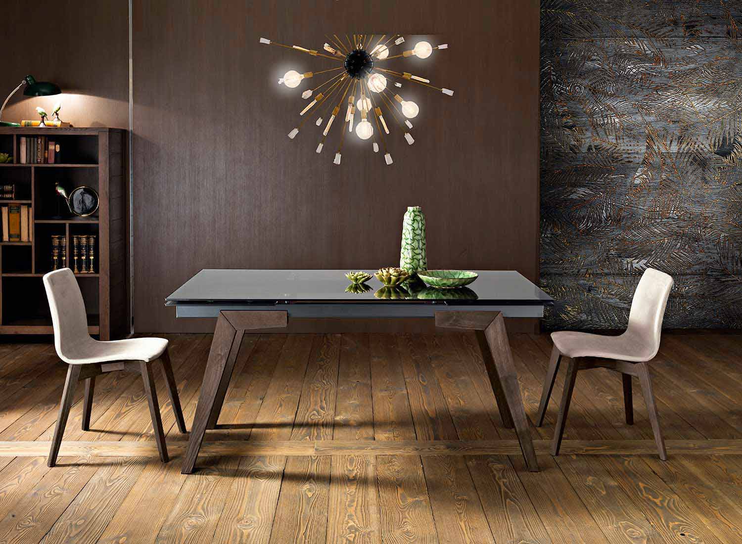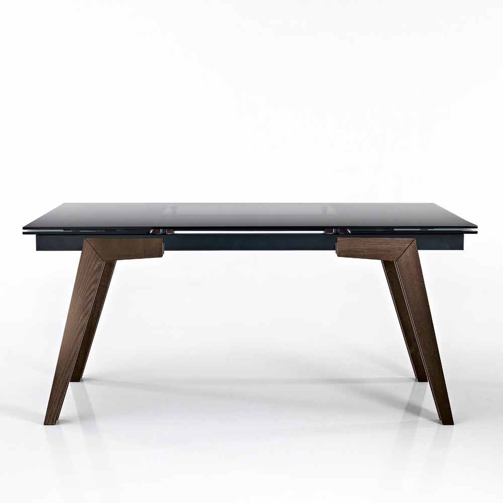 Dimitri is an elegant extendable table realized in Italy with a fumè tempered glass surface (thickness 10mm) and a oak solid wood surface available in two different finishes: