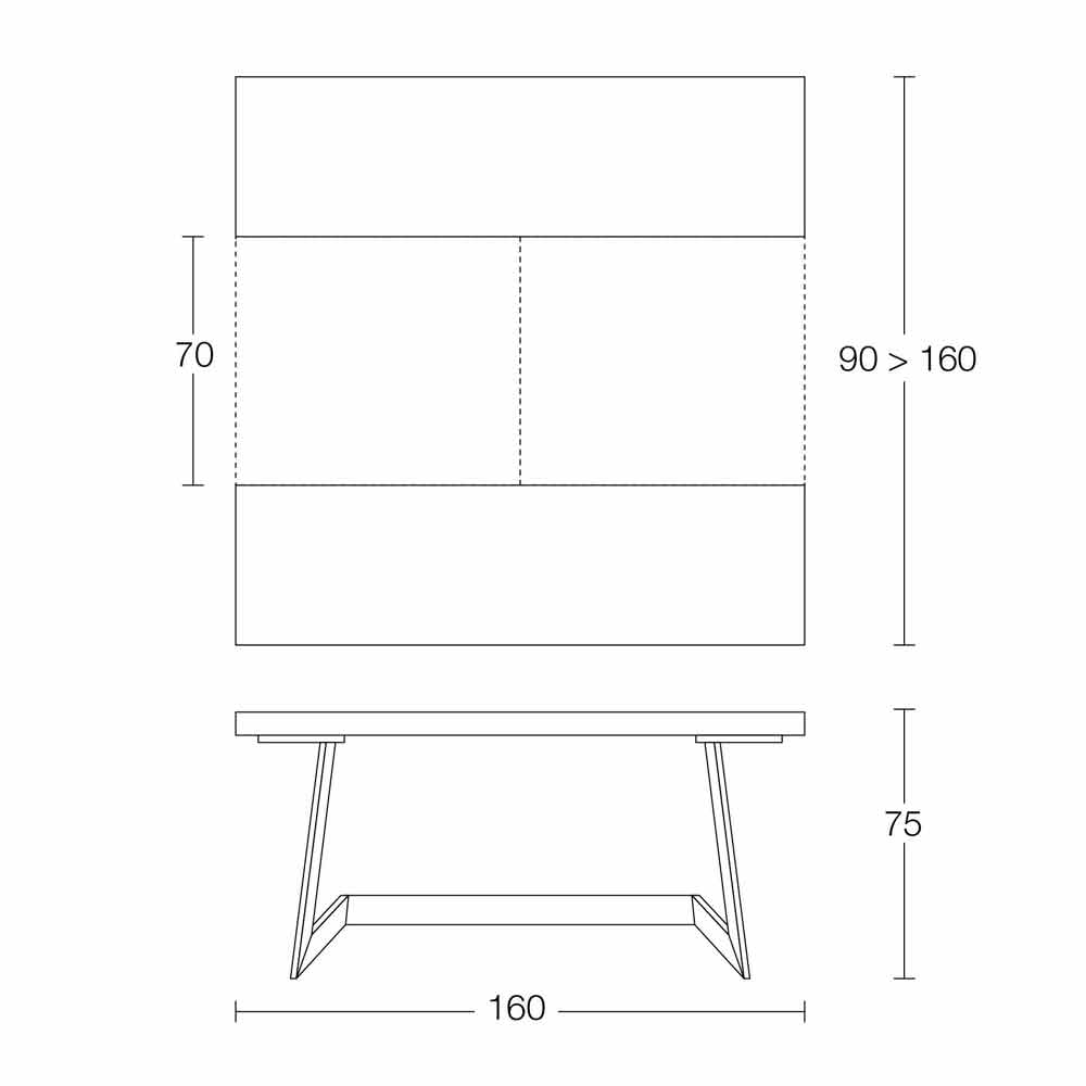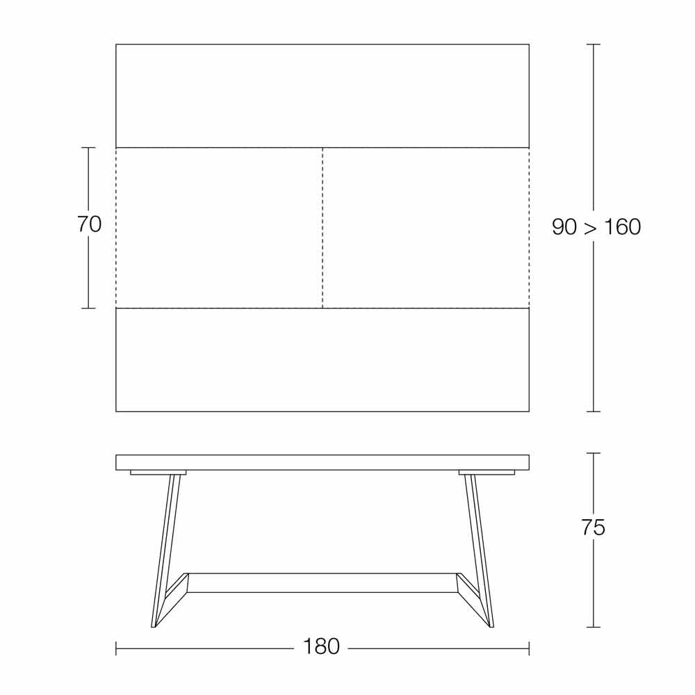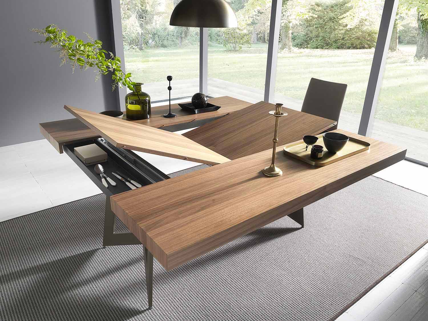 Its peculiar feature consists in the way it expands from a rectangular to a square table to accommodate from 4 to 8 people.