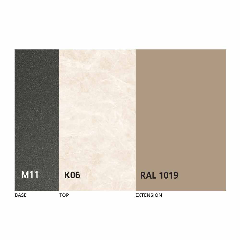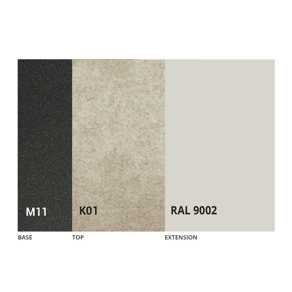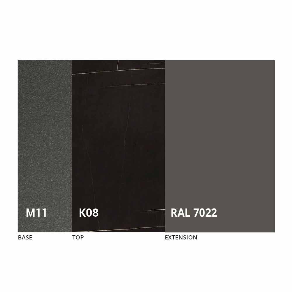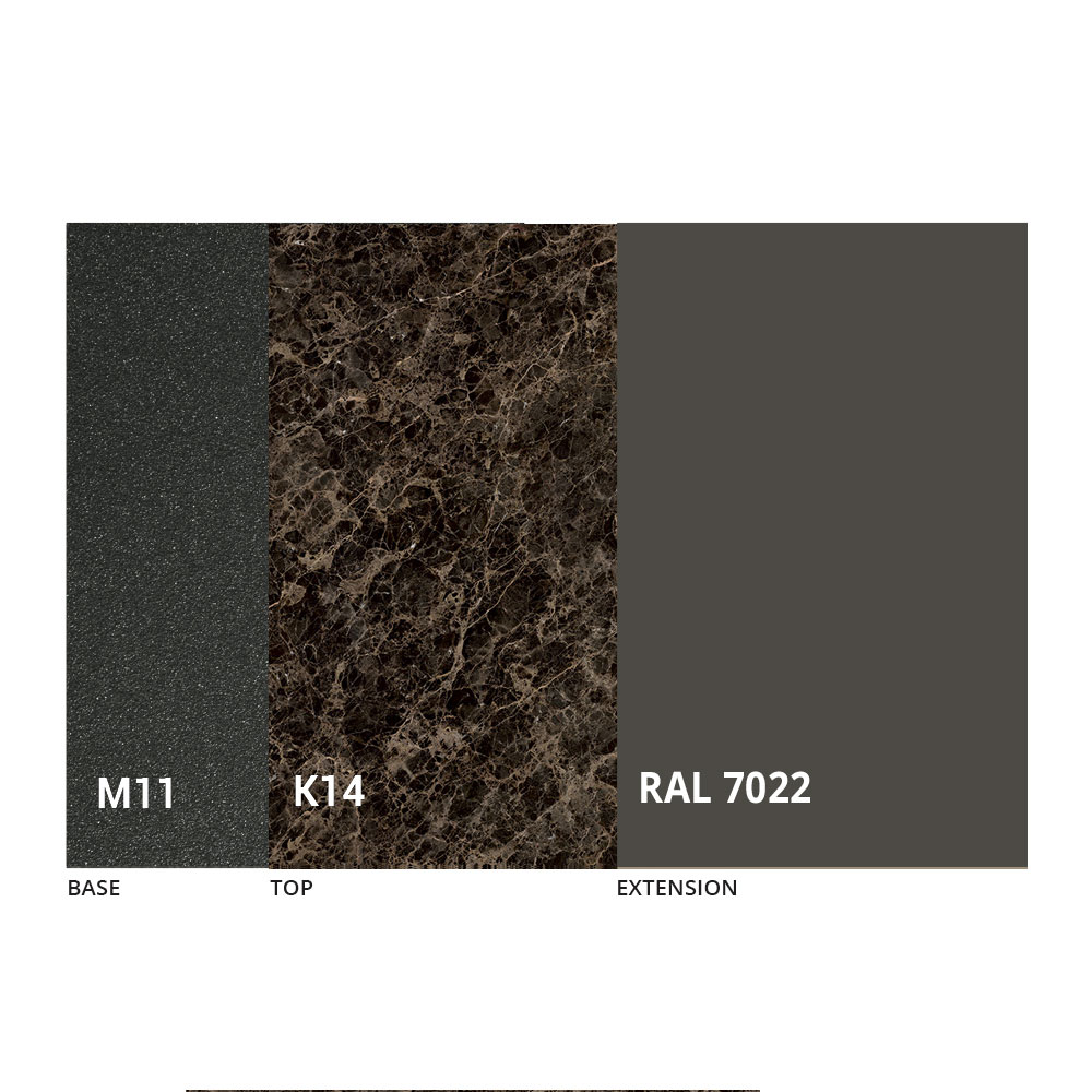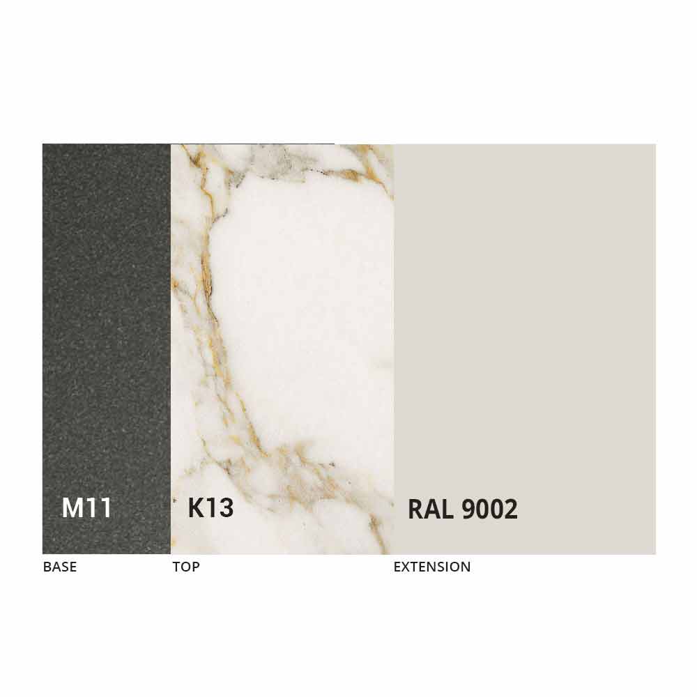 The top, the extension and the base of the table can be customized with different sample finishes. For information, contact us using the "