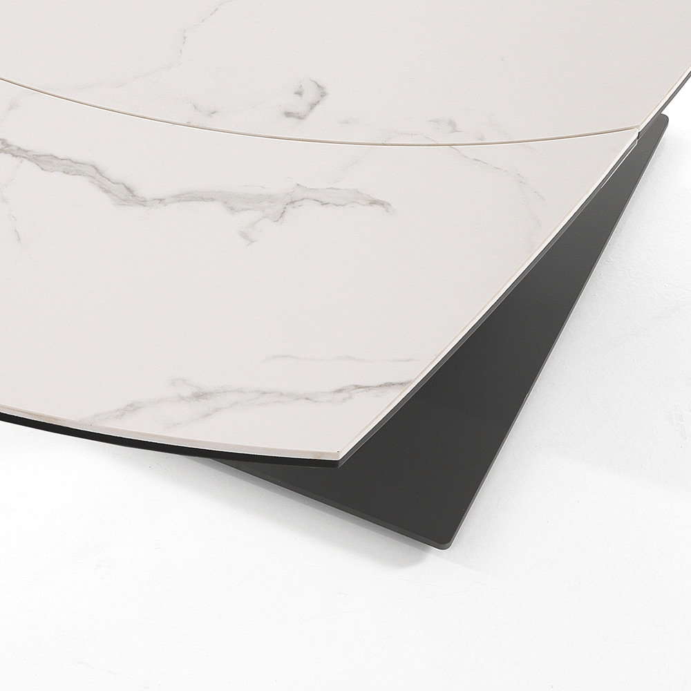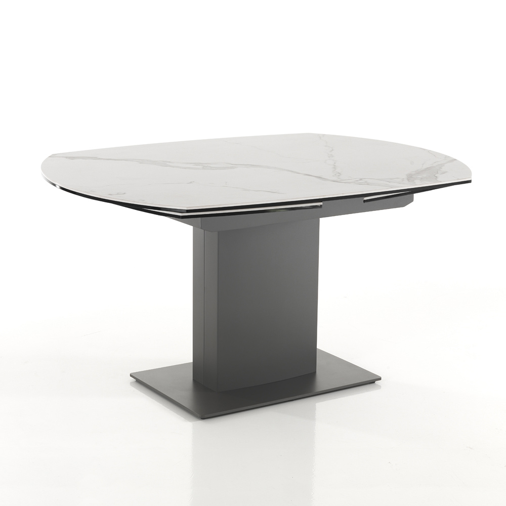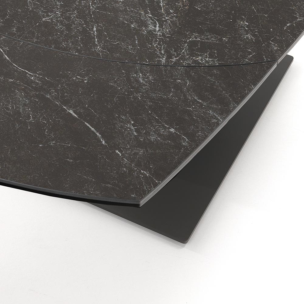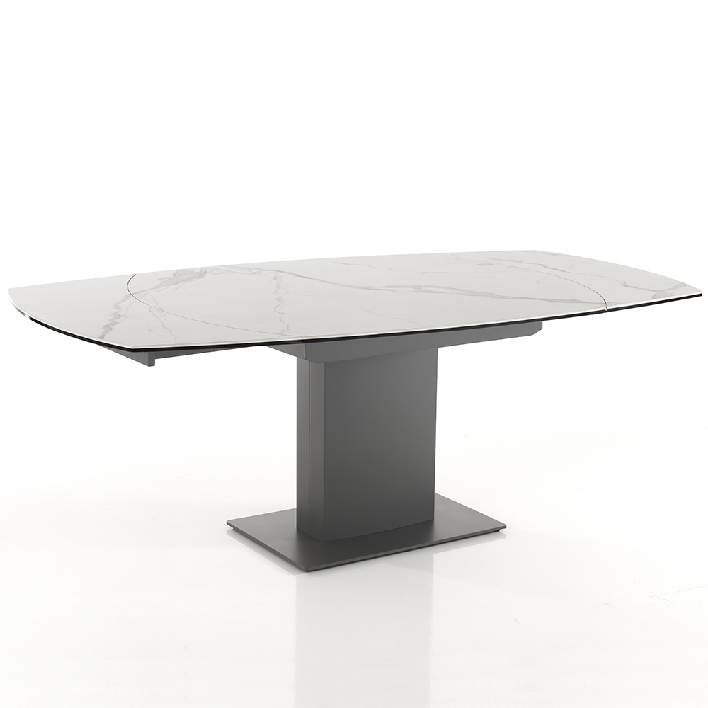 Dining table with structure in matt gray painted steel and extendable top made of ceramic with matt marble finish (thickness 12mm). Thanks to a 60 cm extension positioned under the top and opening with a practical swivel mechanism , the table can reach a maximum length of 180 cm allowing it to accommodate a greater number of guests for wonderful lunches and dinners with friends. The perfect combination of the elegance of the ceramic and the imposing detail of the steel base creates a piece of furniture with a unique personality and a strong visual impact, ideal for conquering the center of attention in dining rooms or modern kitchens.