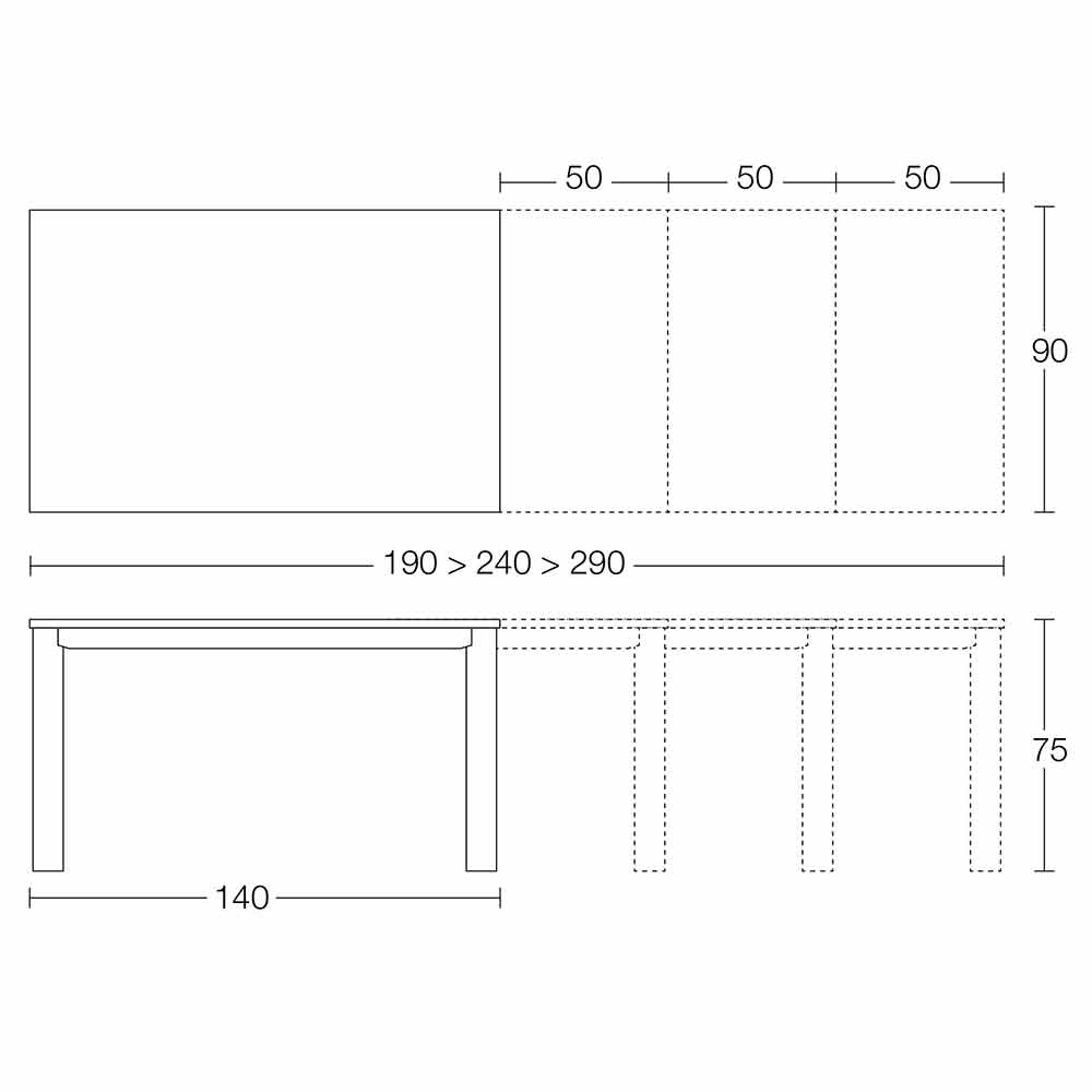 The top can be extended thanks to a telescopic mechanism with 3 internal extensions of length equal to 50 cm each in MDF. The extensions are not in the same color as the top.