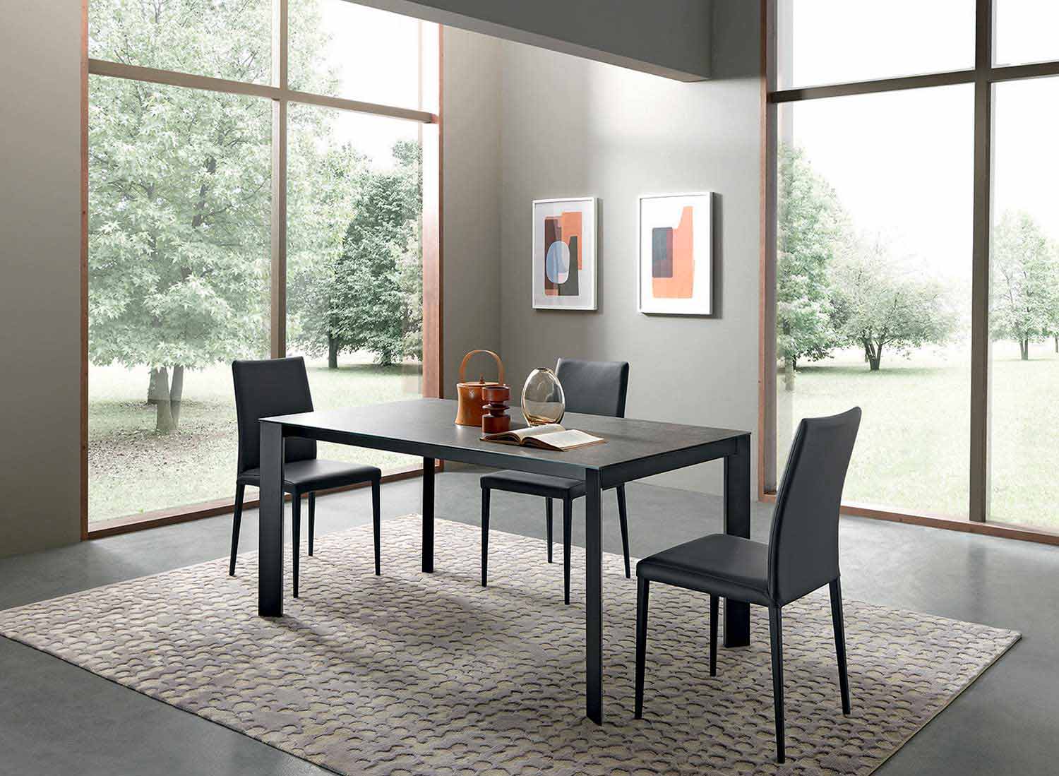 Its peculiar feature is given by the triangular shape of the legs which outlines a minimal and absolutely elegant style. Handcrafted in Italy with high quality materials and 100% made in Italy. Featuring an extendable ceramic top on MDF and a matt black painted metal base.