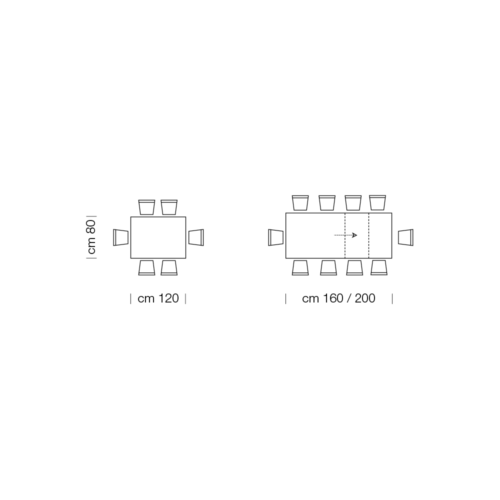 - L 120 (160) x P 80 x H 76 cm 8 seats extendable with an internal 40cm extension;
