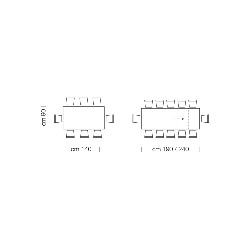 - L 140 (240) x P 90 x H 76 cm 12 seats extendable with two extensions of 50cm each inside;