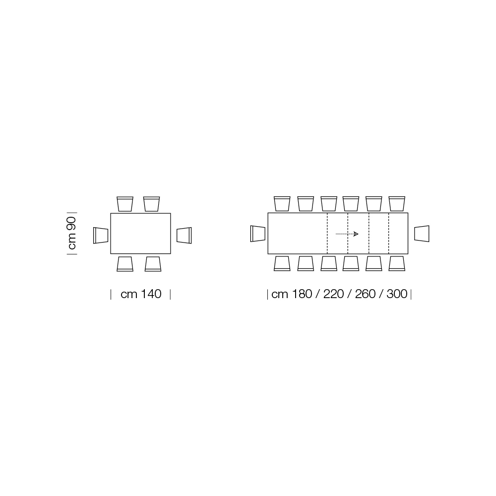 - L 140 (300) x P 90 x H 76 cm 14 seats extendable with four extensions of 40cm each inside;