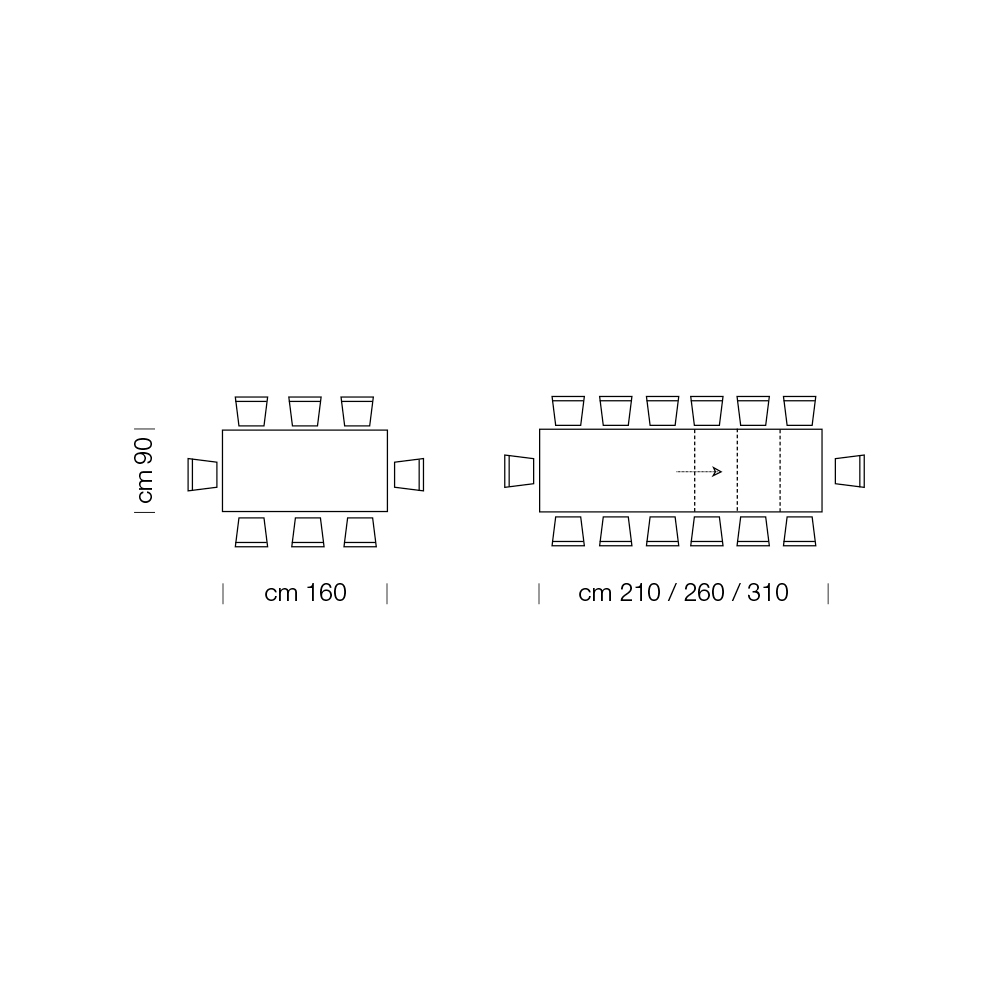 - L 160 (310) x P 90 x H 76 cm 14 seats extendable with three extensions of 50cm each inside.