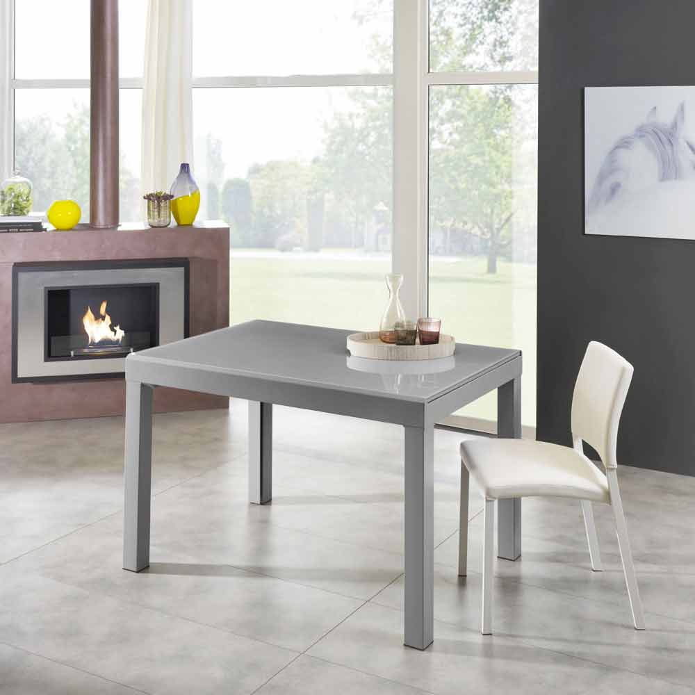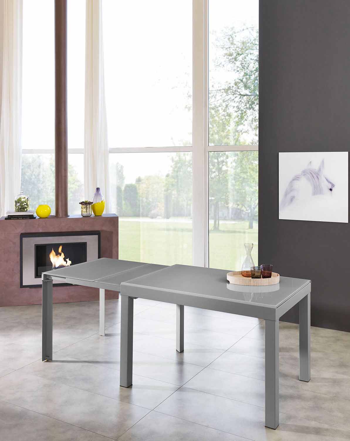 The table is made with a gray painted metal structure and tempered glass and melamine top of the same color as well as the internal extensions, also in gray tempered glass.