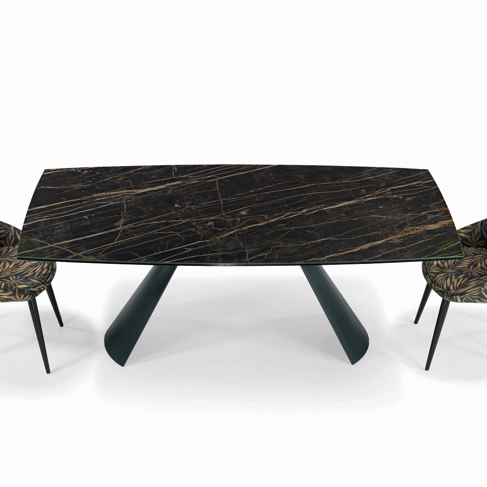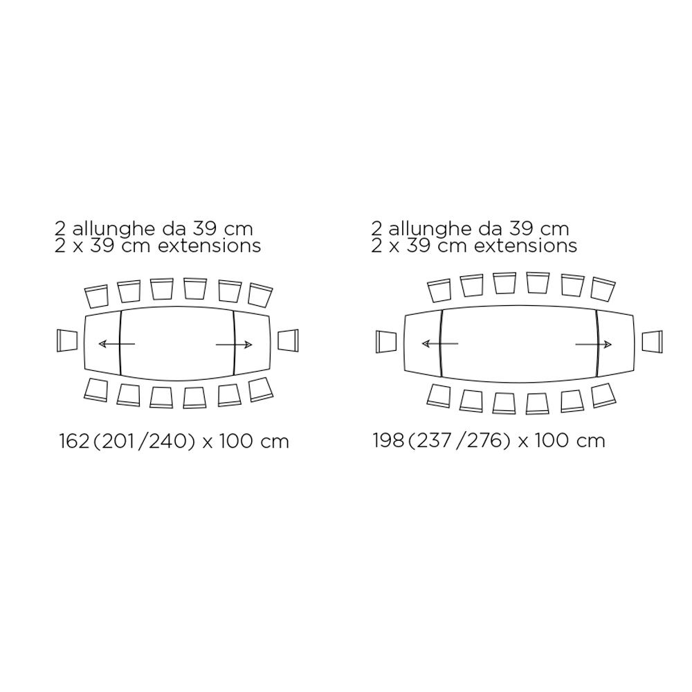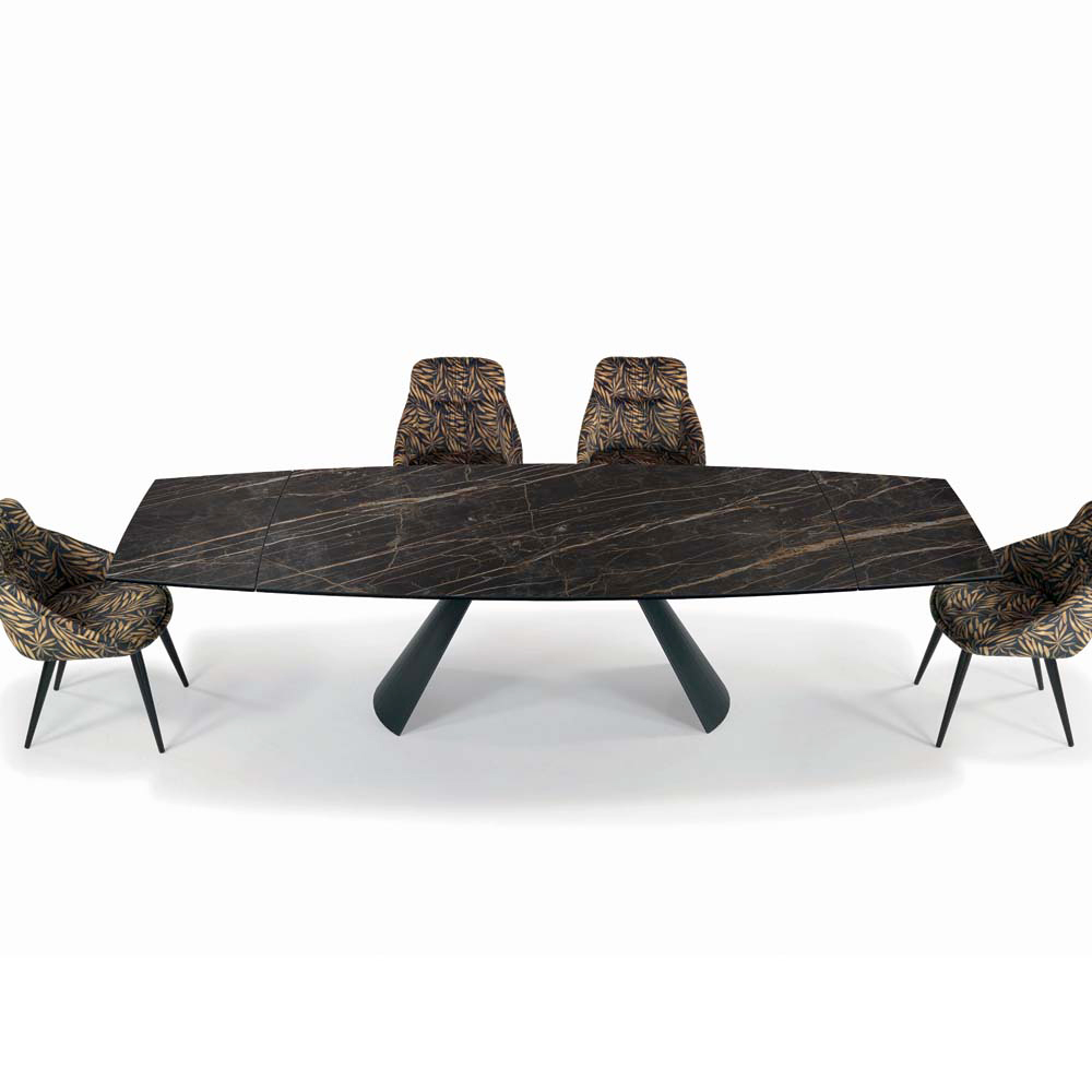 Extendable barrel-shaped living room table with integrated extensions, with ceramic top, straight edge , lacquered steel base and adjustable feet. The choice of top quality materials and the attention in the creation of every single detail create a product of excellent quality Made in Italy . Thanks to the shape of the base and the available finishes, this table is the protagonist of any daily contract environment , becoming a perfect idea for all those who want to give the room an elegant, sumptuous and unique touch.