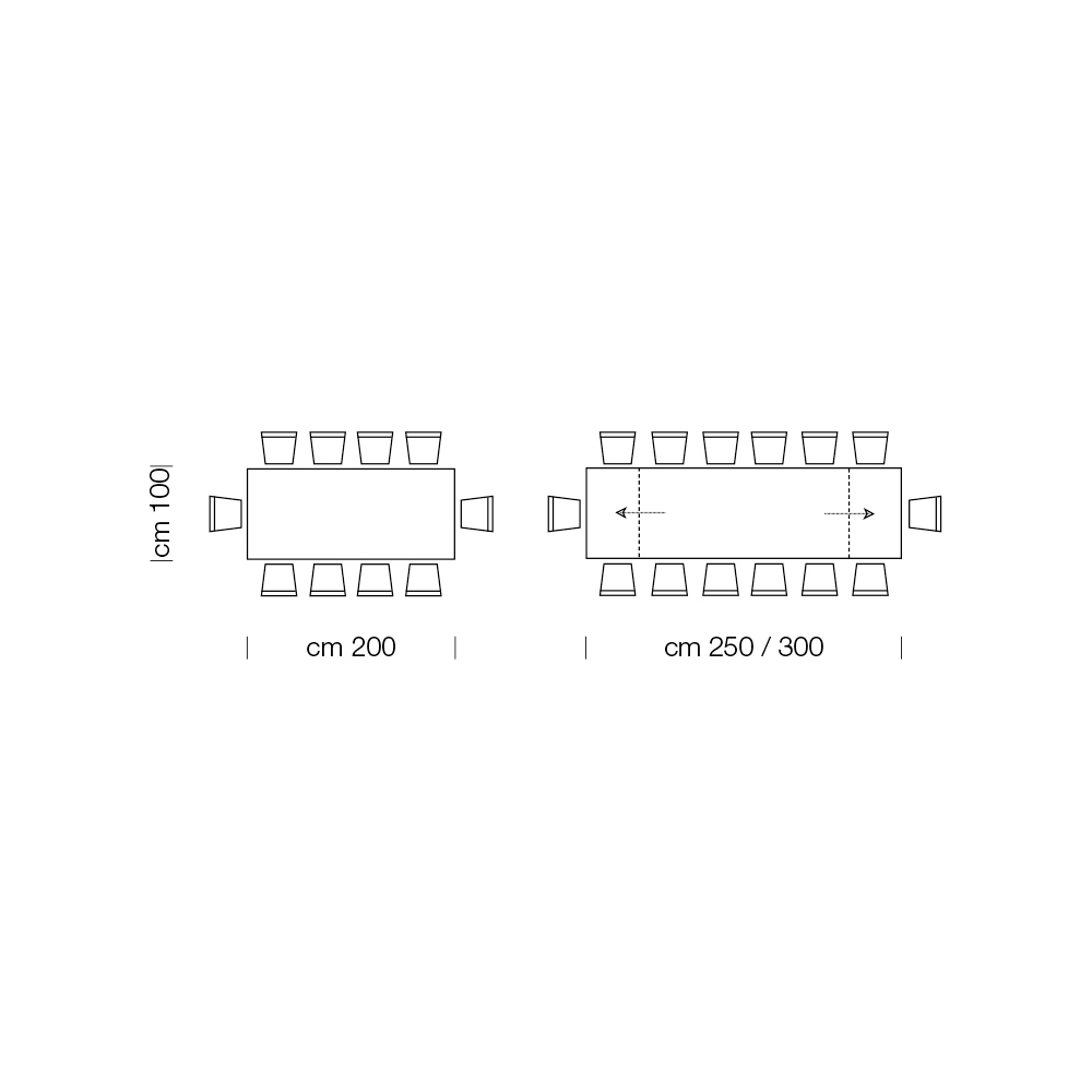 - L 200 (300) x W 100 x H 76 cm 14 seats extensible with 2 extensions of 50 cm outside.