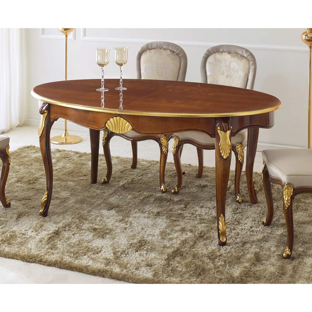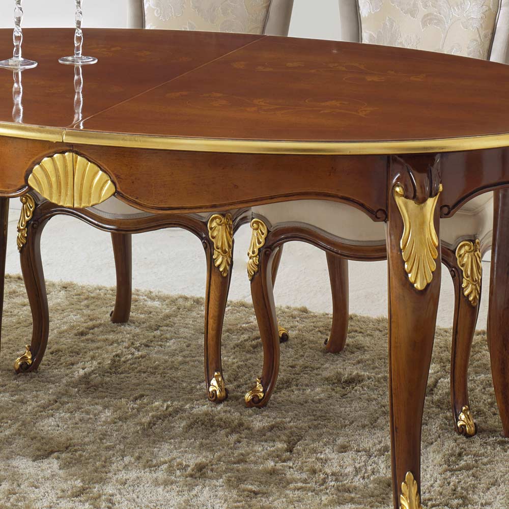 Oval dining table with extendable top thanks to two 50 cm internal extensions, made entirely of wood and available in Bassano walnut and antique gold or white and gold wood finishes. A unique and refined complement, completely made in Italy by skilled master craftsmen , masters of art who finish each complement with wisdom and taste for elegance. The production is carried out using fine materials , and performing the workbyhand with the utmost care and professionalism that distinguishes Made in Italy products.