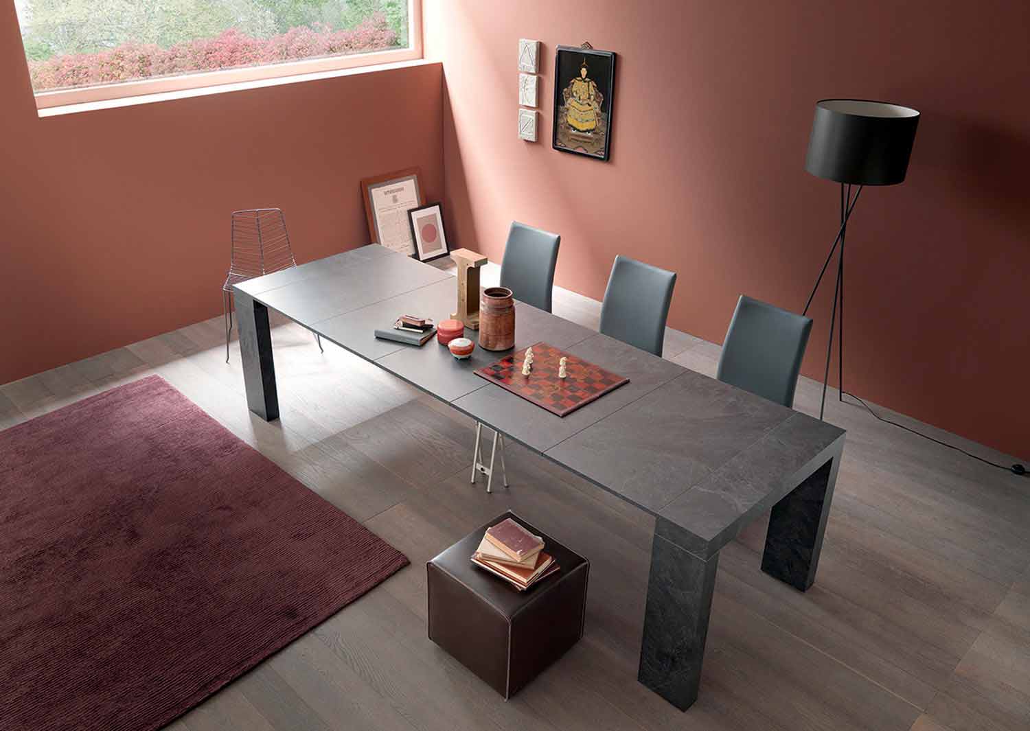 This extendable console is outlined by an important and monumental design that becomes the protagonist of the room in a scenic and functional way. Its peculiar feature is the transformation from console todining table thanks to the aluminum telescopic mechanism.