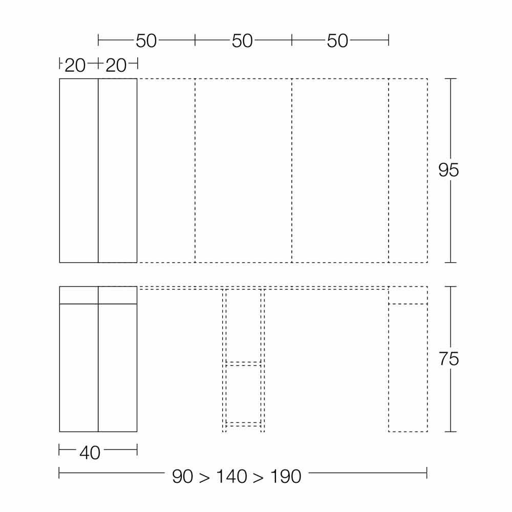Console: L 95 x D 40 x H 75 cm; Table W 90/140/190 x D 95 x H 75 cm