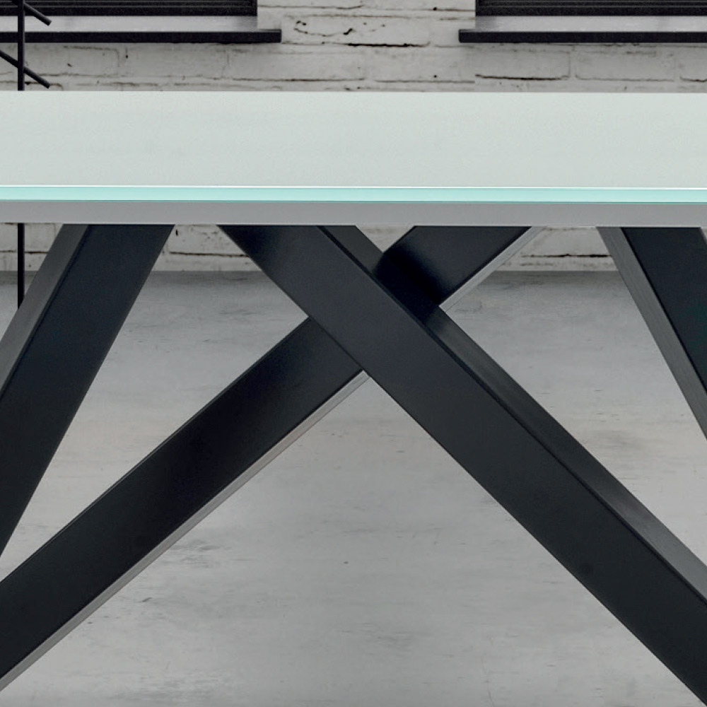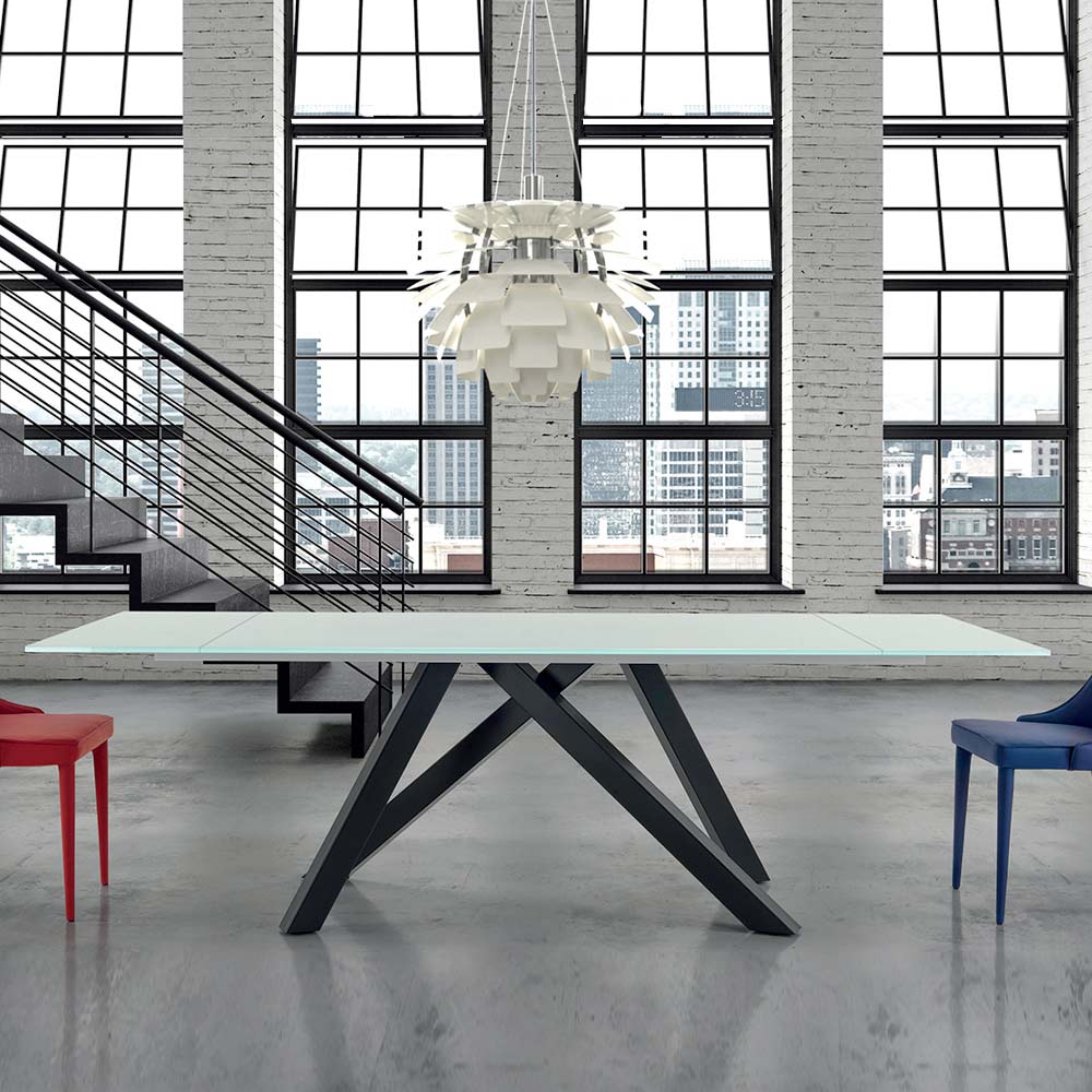 Kitchen table extendable up to 300 cm with glass top and dove-gray steel base made in Italy.