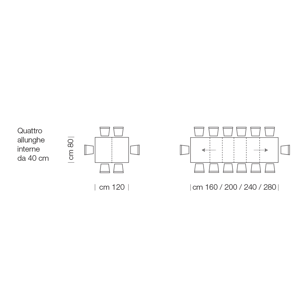 - L 120 (280) x P 80 x H 76 cm 14 seats extendable with four internal 40cm extensions;