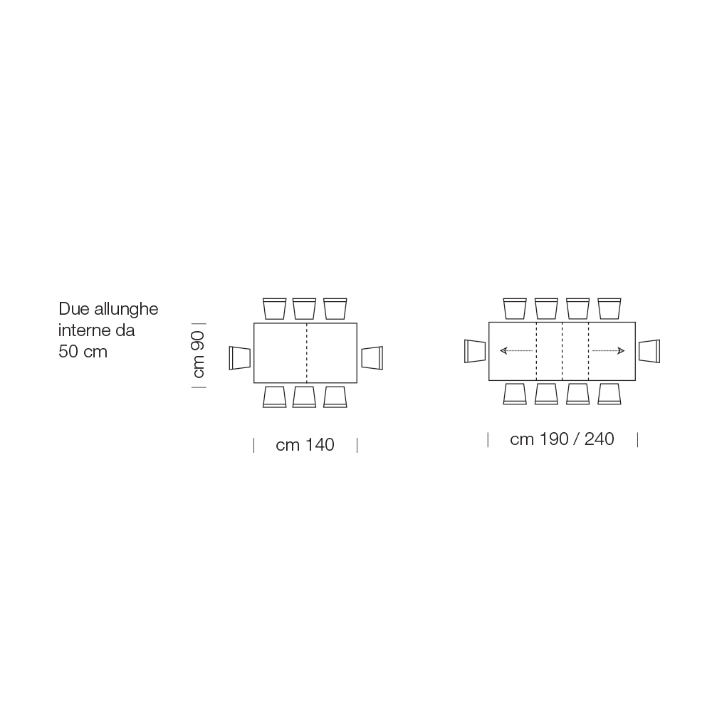 - L 140 (240) x P 90 x H 76 cm 10 seats extendable with two extensions of 50cm each inside;
