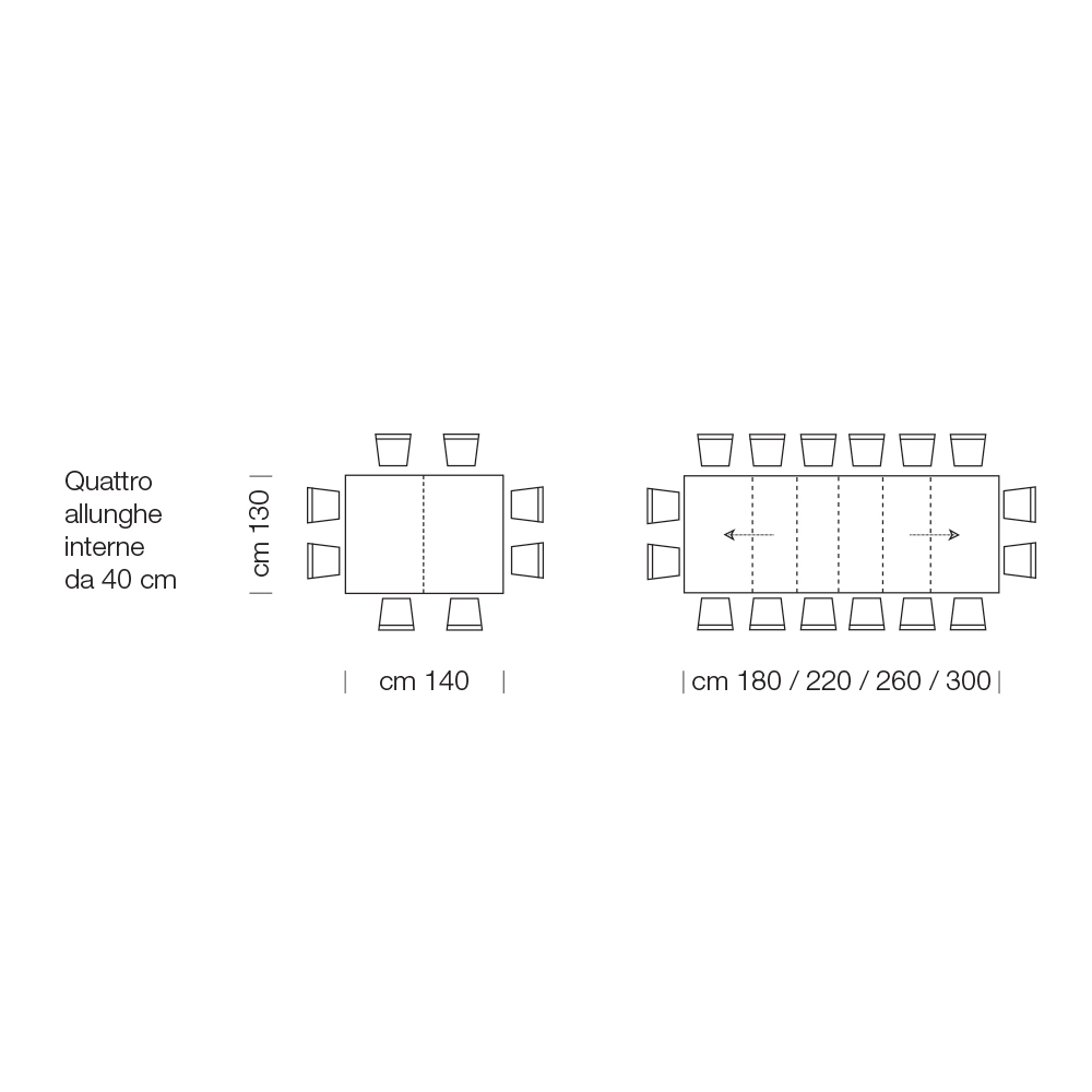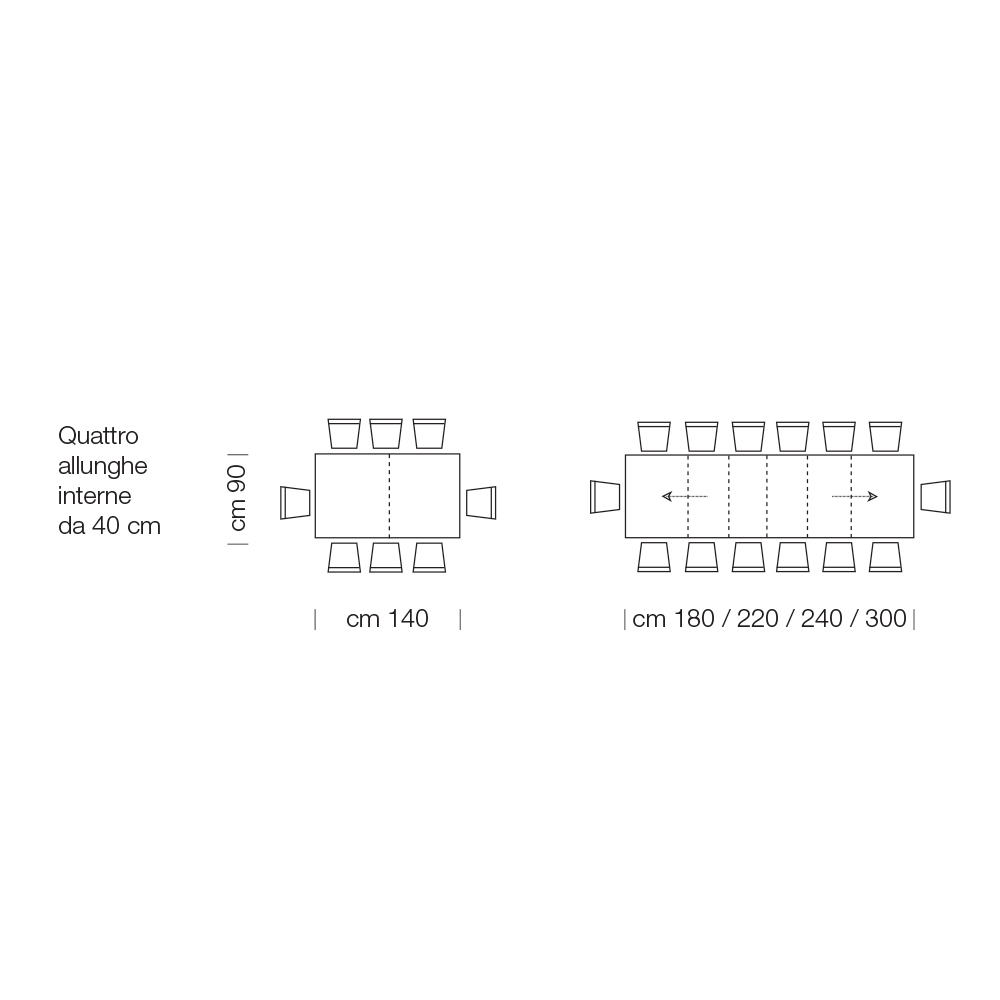 - L 140 (300) x P 90 x H 76 cm 14 seats extendable with four internal 40cm extensions;