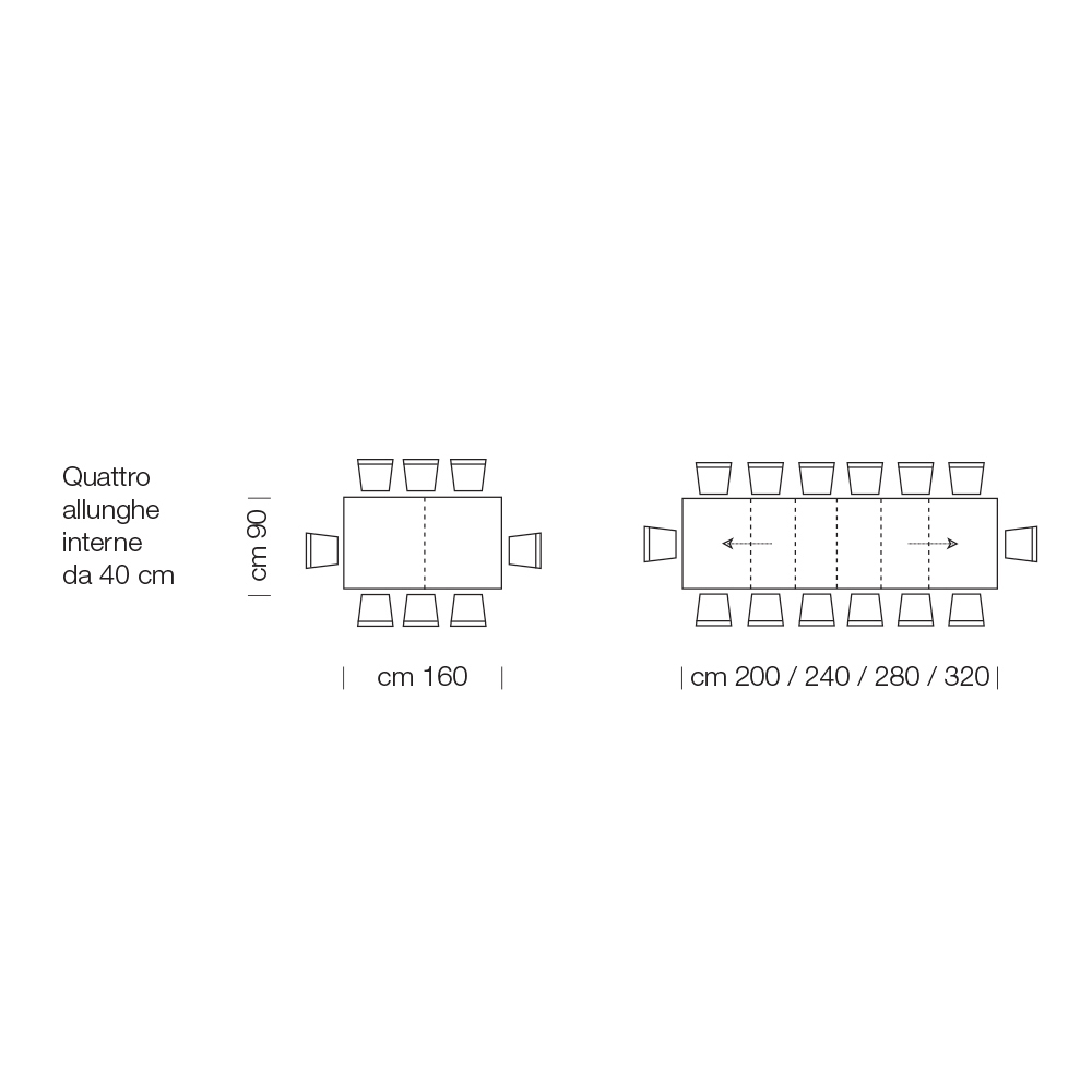 - L 160 (320) x P 90 x H 76 cm 14 seats extendable with four internal 40cm extensions;