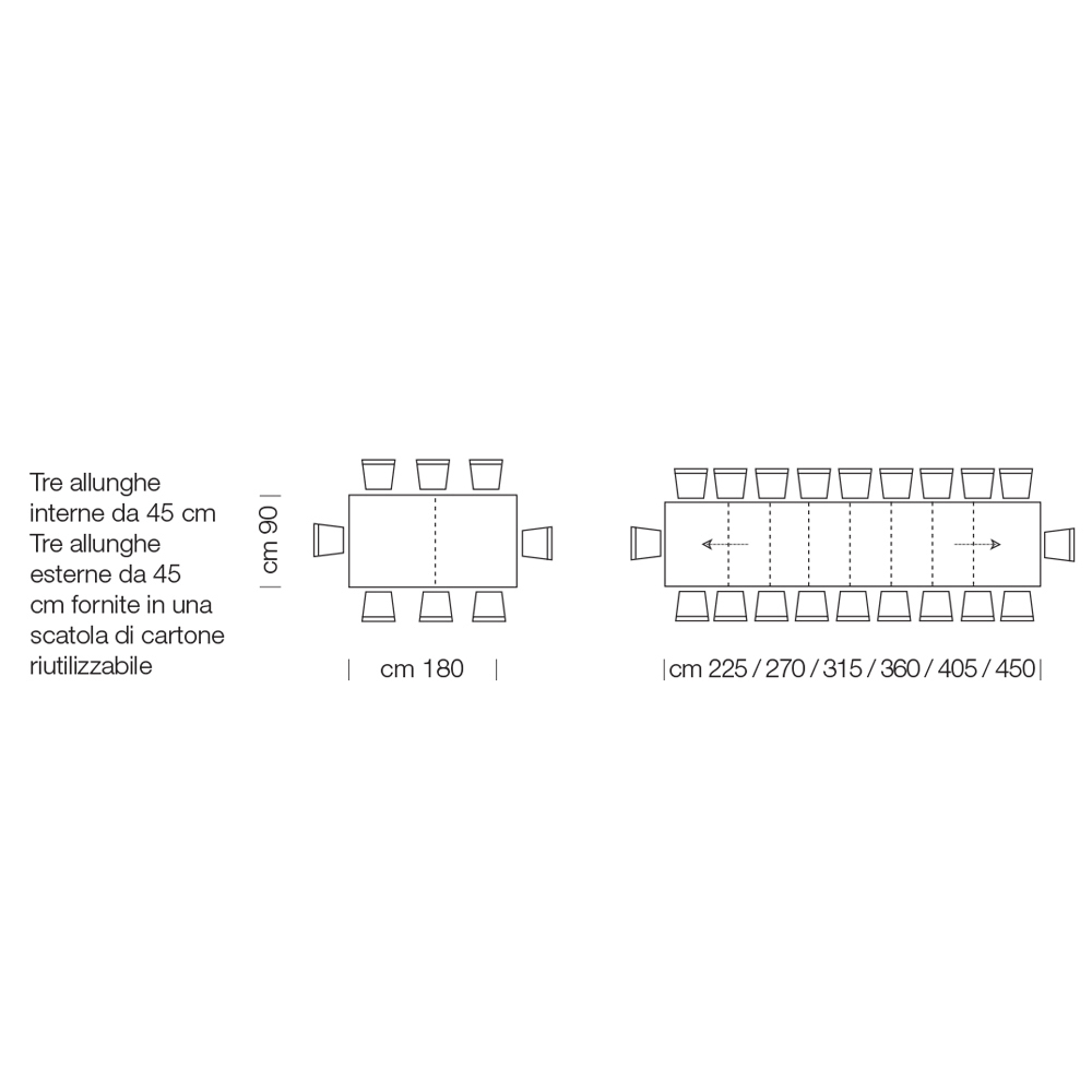 - L 180 (450) x P 90 x H 76 cm 20 seats extendable with six extensions of 45cm, three internal and three supplied in a reusable cardboard box;