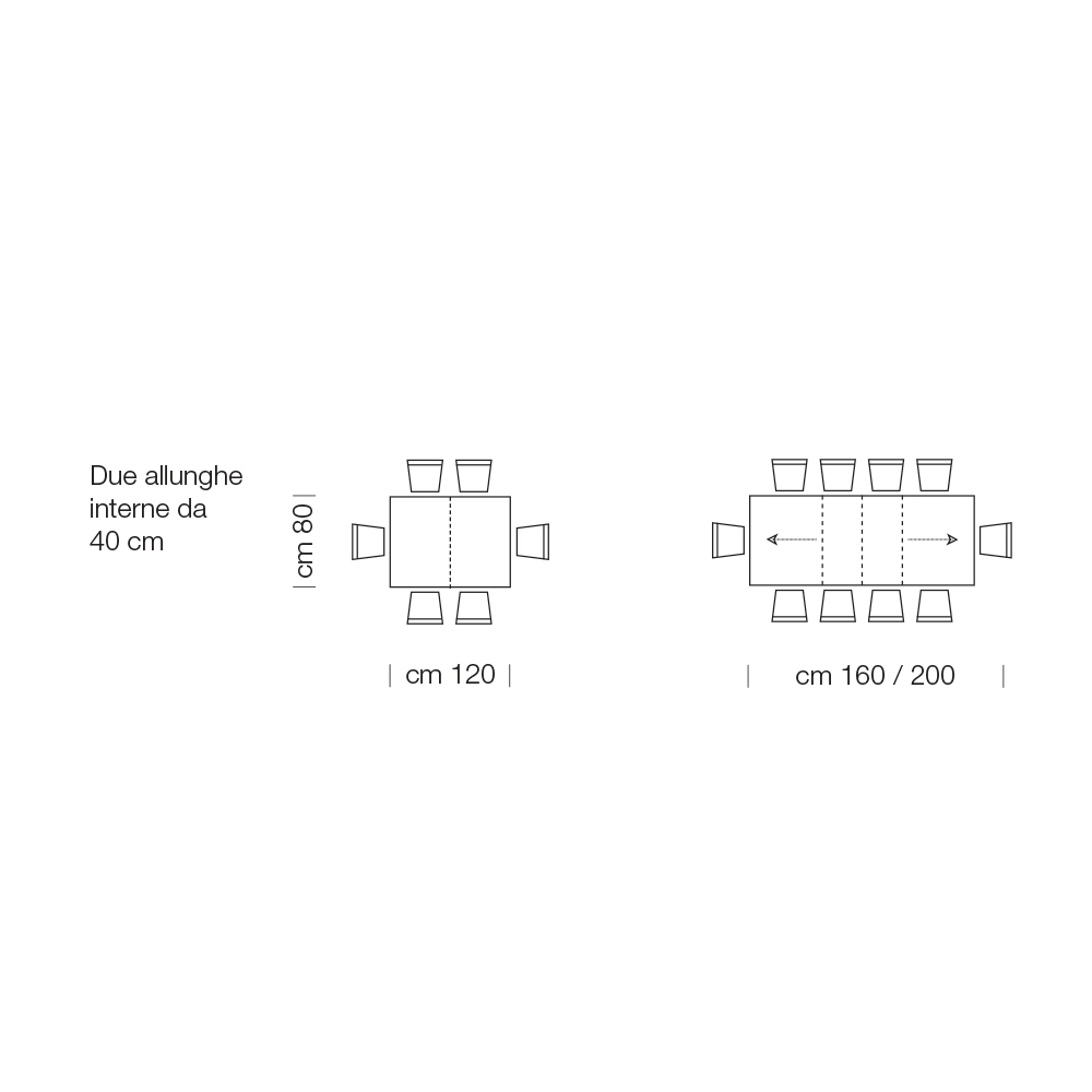 - L 120 (200) x P 80 x H 76 cm 10 seats extendable with two internal 40cm extensions;