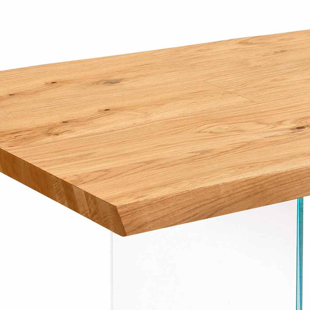 The Nico table is characterized by a design played on the contrast between different materials such as wood and glass. The base is in fact made of 12 mm extra-light tempered glass, while the top is in raw oak veneer with a peeled and peeled edge.