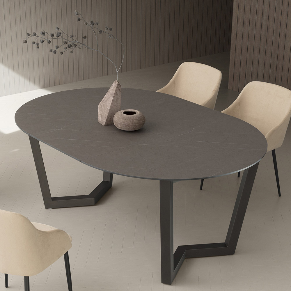 Dining table with topround made in Italy in stratified hpl with a thickness of 10 mm with legs in epoxy powder coated metal in moka finish. A piece of furniture characterized by an elegant and sculptural structure that comes from the combination of materials of different nature together with the passion for workmanship.