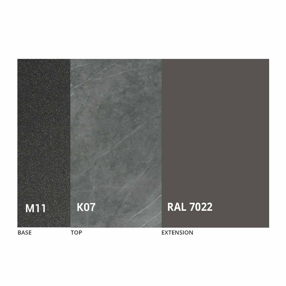 The top and base of the table can be customized with different materials and sample finishes or RAL lacquering. For information, contact us using the appropriate "