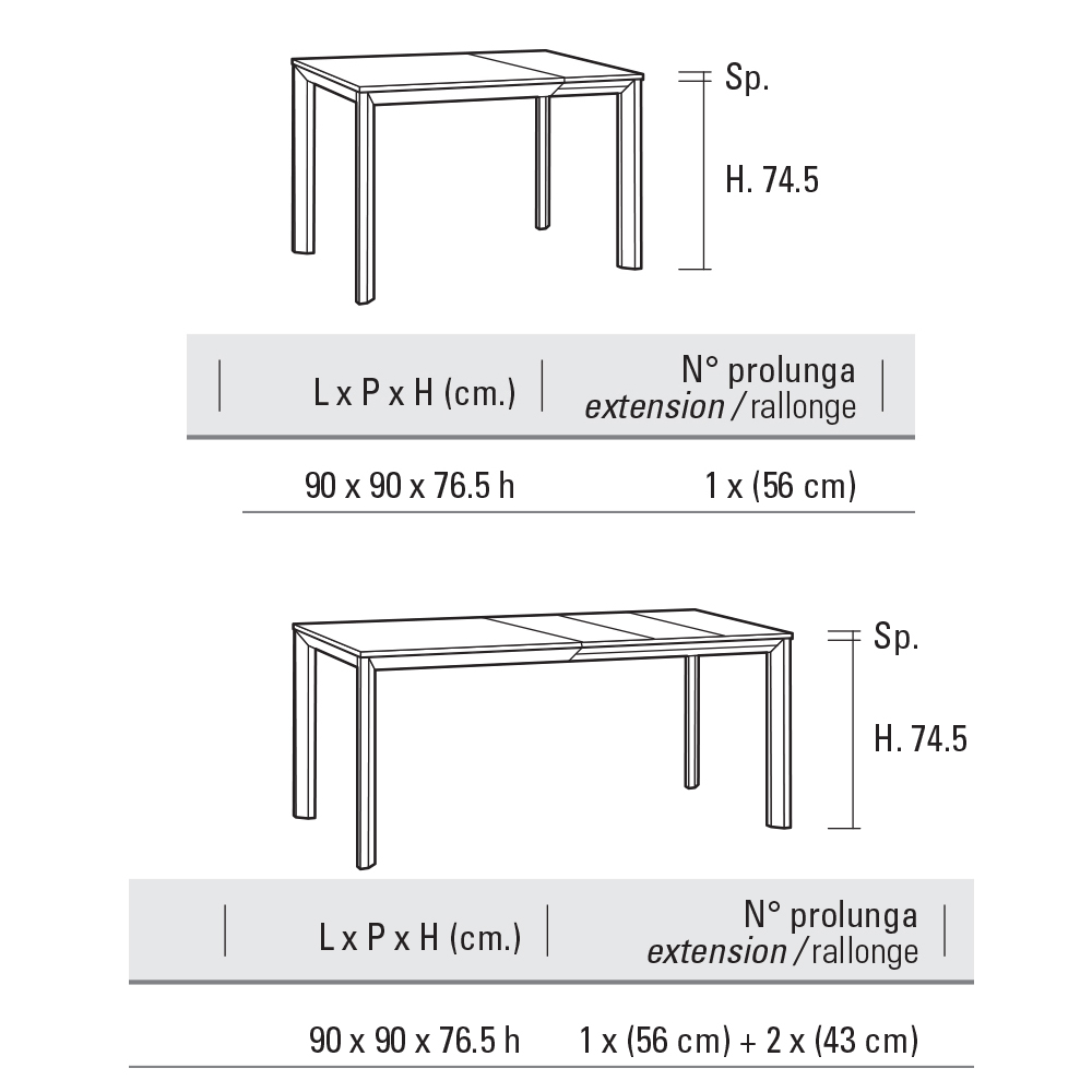 - L 90/232 x P 90 x H 76.5 cm (1 extension of 56 cm + 2 extensions of 43 cm).