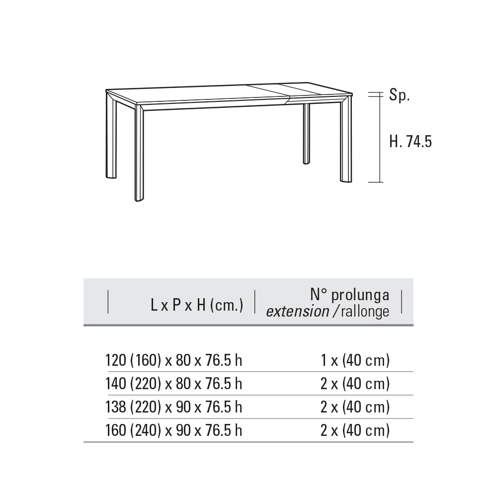- L 140/220 x P 80 x H 76.5 cm (2 extensions);