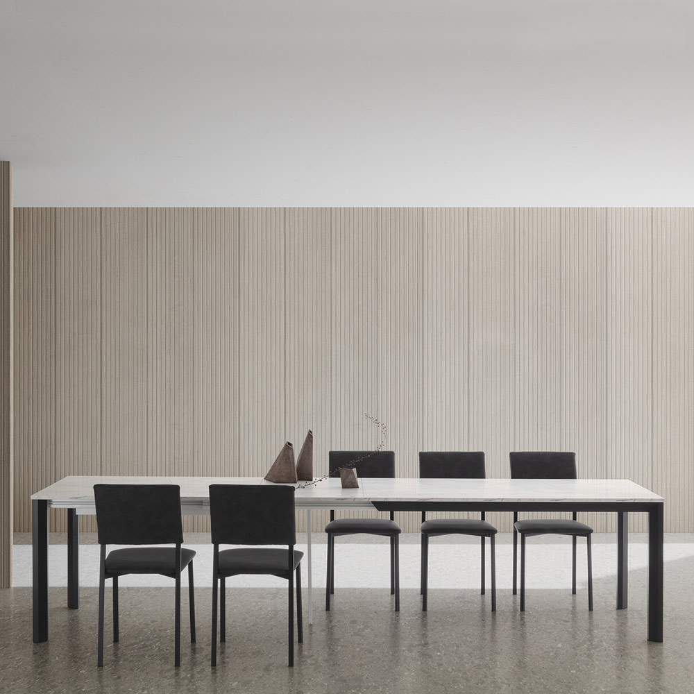 Extendable kitchen table up to 334 cm made in Italy with matt black finish anodized aluminum structure, HPL top with aluminum guide on acetal resin runnersavailable in different finishes and in four different sizes.