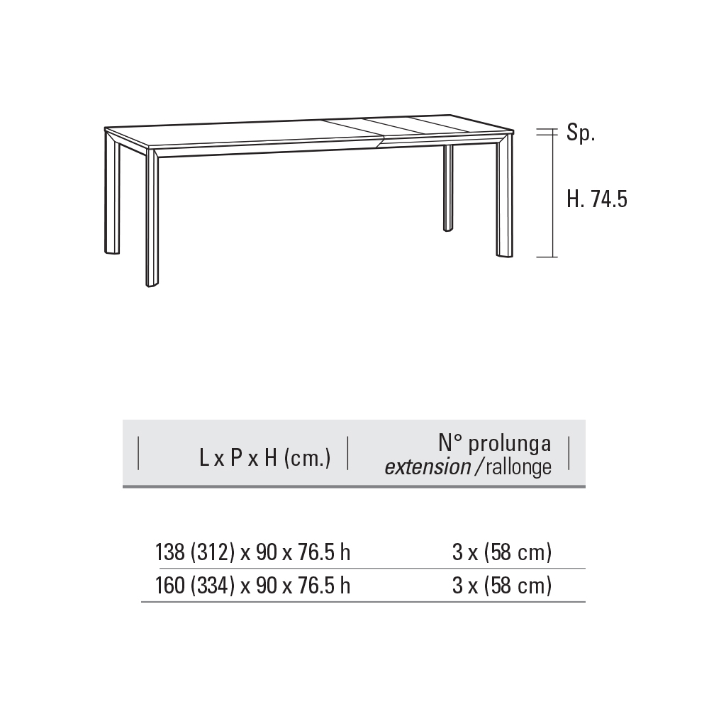 The three extensions of 58 cm eachmade in the same material as the top, they allow this piece of furniture to extend up to a maximum length of 334 cm, thus creating a practical and exclusive solution capable of winning attention and satisfying every type of need.