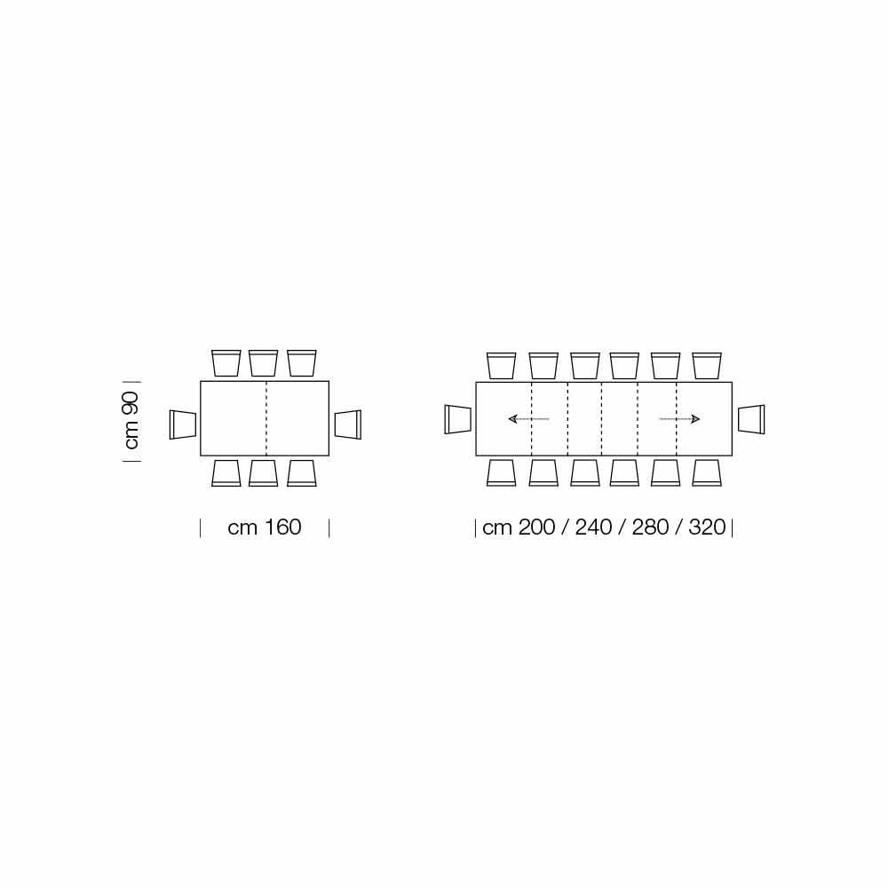 L 160 (320) x D 90 x H 76 cm 14 seats extendable with four extensions of 40cm inside;