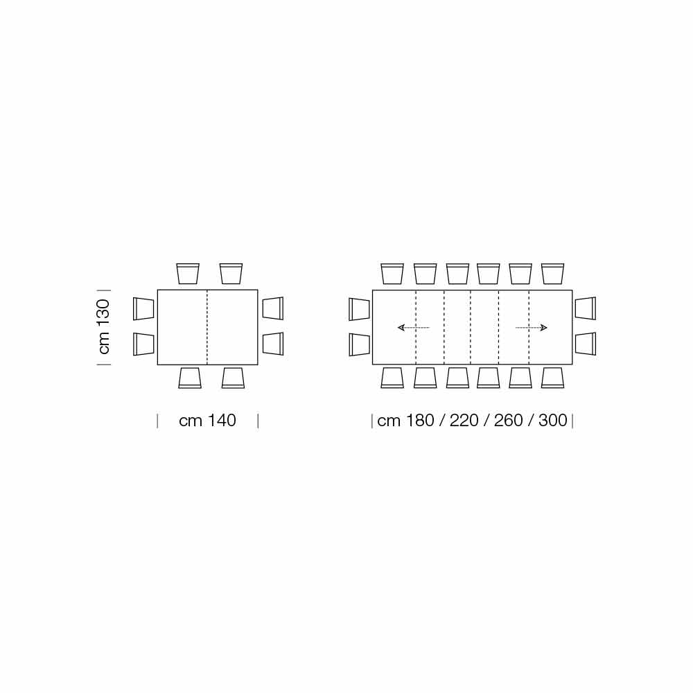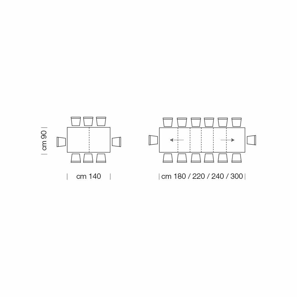 L 140 (300) x D 90 x H 76 cm 14 seats extendable with four extensions of 40cm inside;