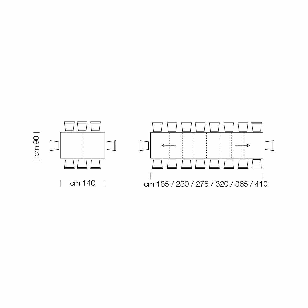 L 140 (410) x D 90 x H 76 cm 18 seats extendable with six extensions 45cm, three internal and three supplied in a reusable cardboard box;