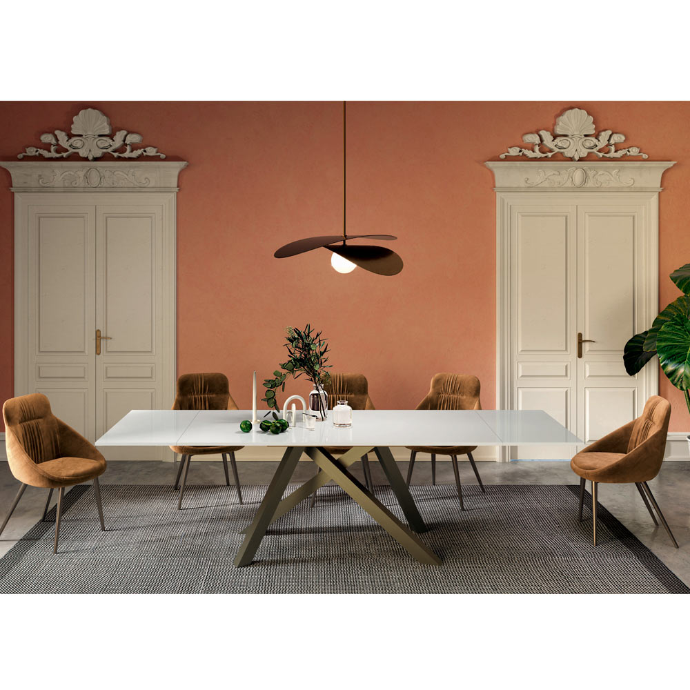 Extendable living room table with integrated extensions,matt white glass top ,extendable straight edge, antique brass lacquered steel base with adjustable feet. Modern style and elegance meet in this product which completes and makes every domestic and contract environment unique. Thanks to the finishes and materials chosen, all the quality of Made in Italy is guaranteed and a product that is not only beautiful but also functional and practical.
