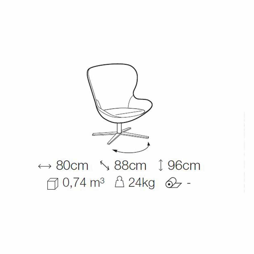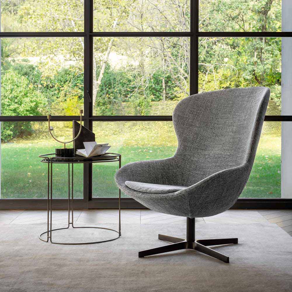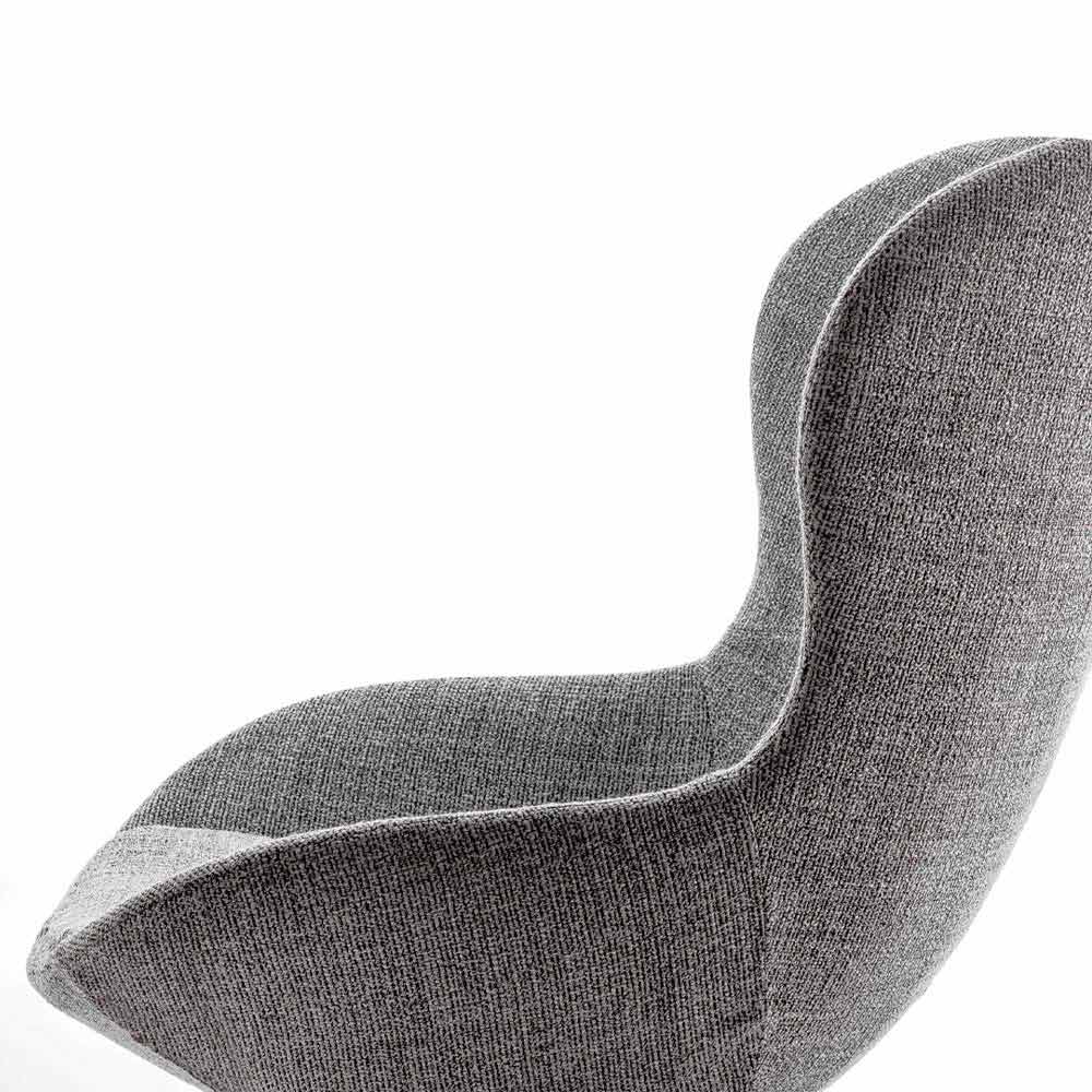 Living room armchair made in Italy with swivel base in anthracite finish lacquered metal and seat covered in fabric with removable cushion in the same color padded with non-deformable polyurethane foam (density 30 kg / m³). Its structure is characterized by soft and enveloping shapes and by imposing but calibrated proportions, designed to give life to a strong sense of welcome. The particular swivel base makes it even more unique and special and at the same time particularly versatile , ideal both for domestic living areas and for environments such as offices or studios where it brings with it an elegant and refined touch as well as a modern soul characterized by a original innovativeness.
